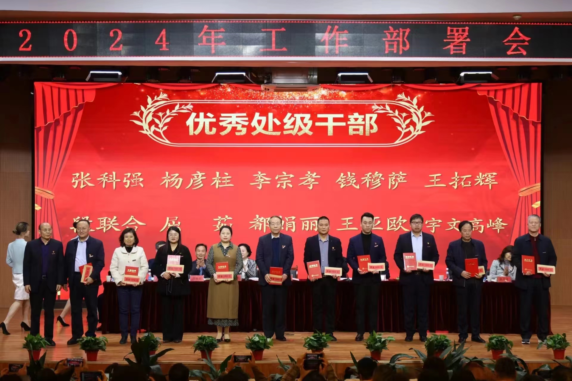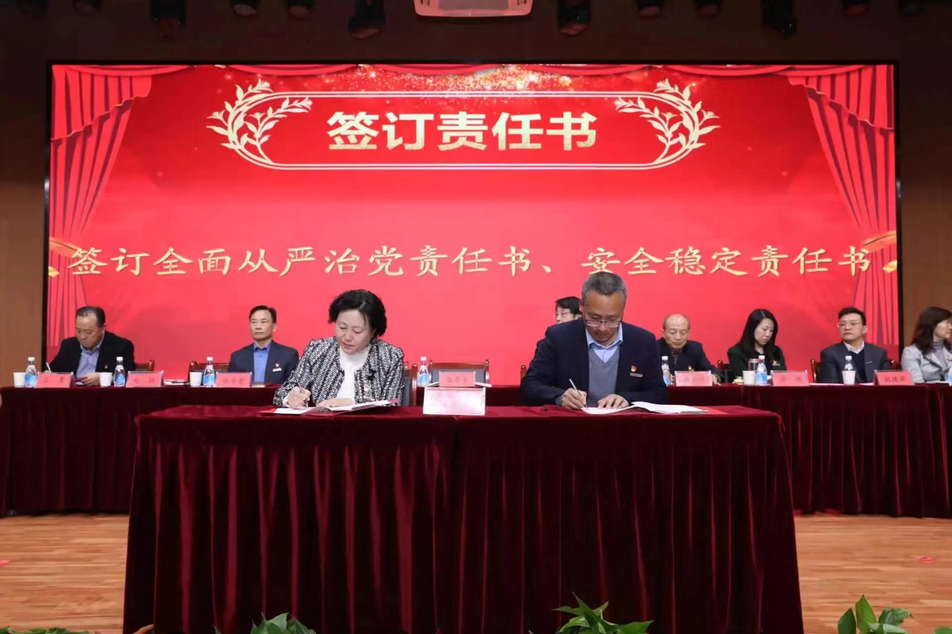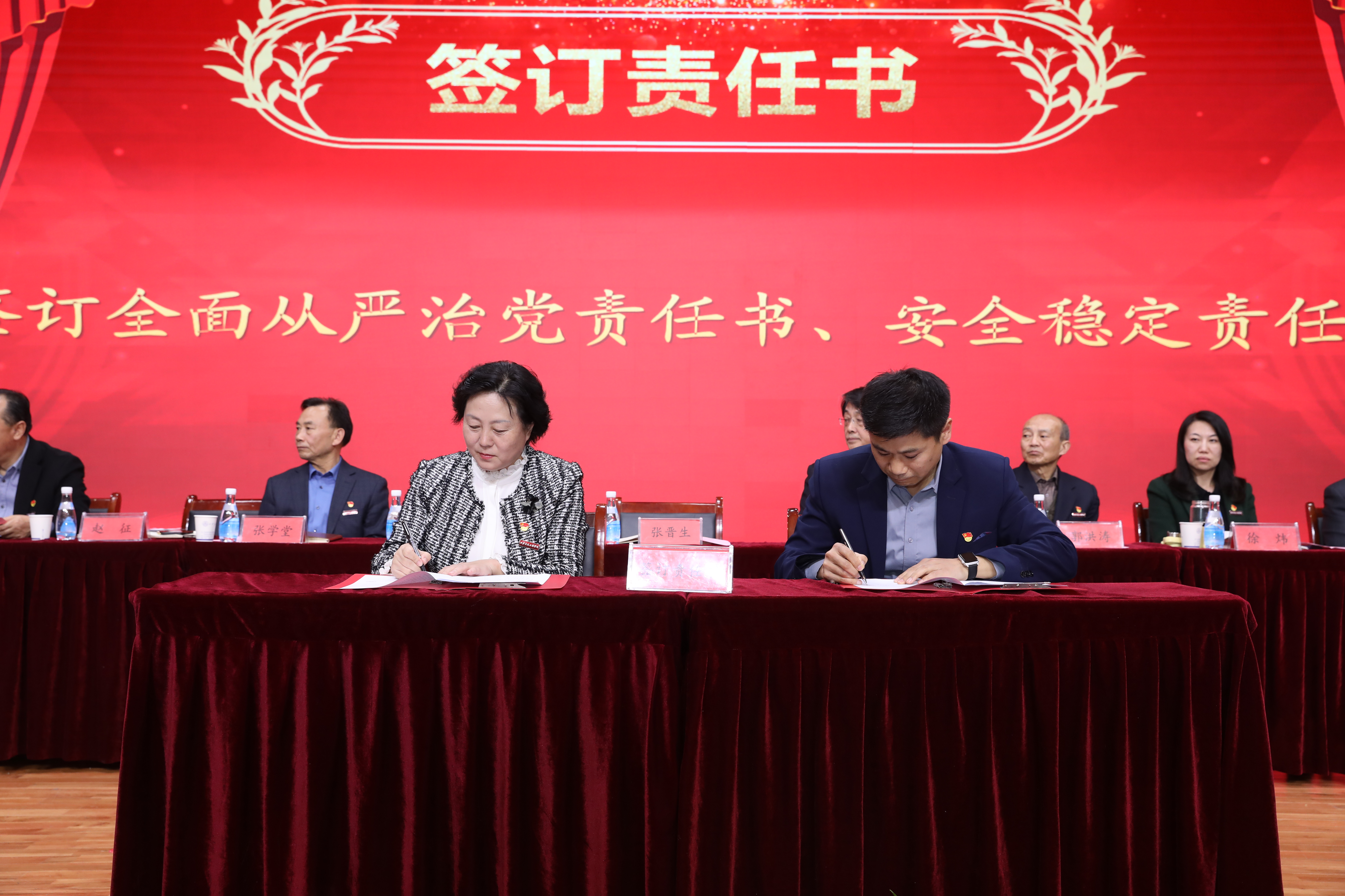 第二阶段会议由李萍书记主持,曹庆年校长宣读了《关于表彰2023年度先进单位 、优秀教师、优秀教育工作者、优秀处级干部的决定》,与会领导为获奖单位和个人颁奖;李萍书记分别与现代技术学院党委、公共课部党总支、机关党委签订了全面从严治党责任书;张晋生理事长分别与学生处、保卫处、人文与管理学院签订了安全稳定责任书。