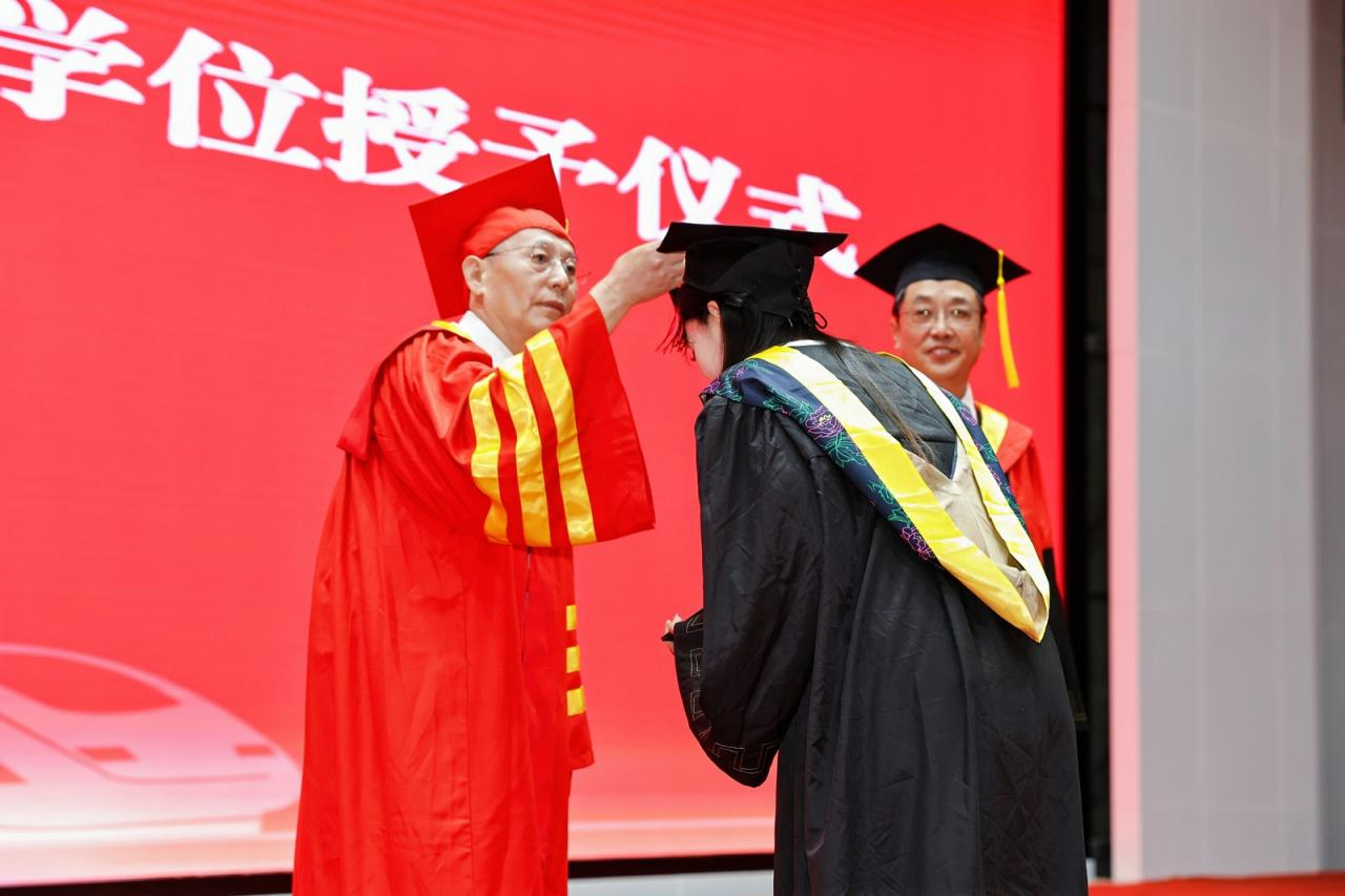 学位评定委员会主席曹庆年教授为毕业生一一拨穗正冠、颁发学位证书,并与学生合影留念