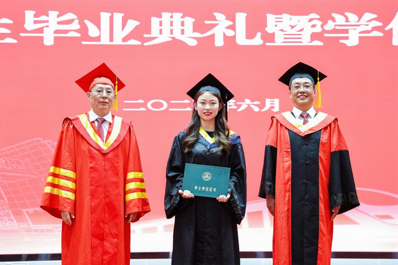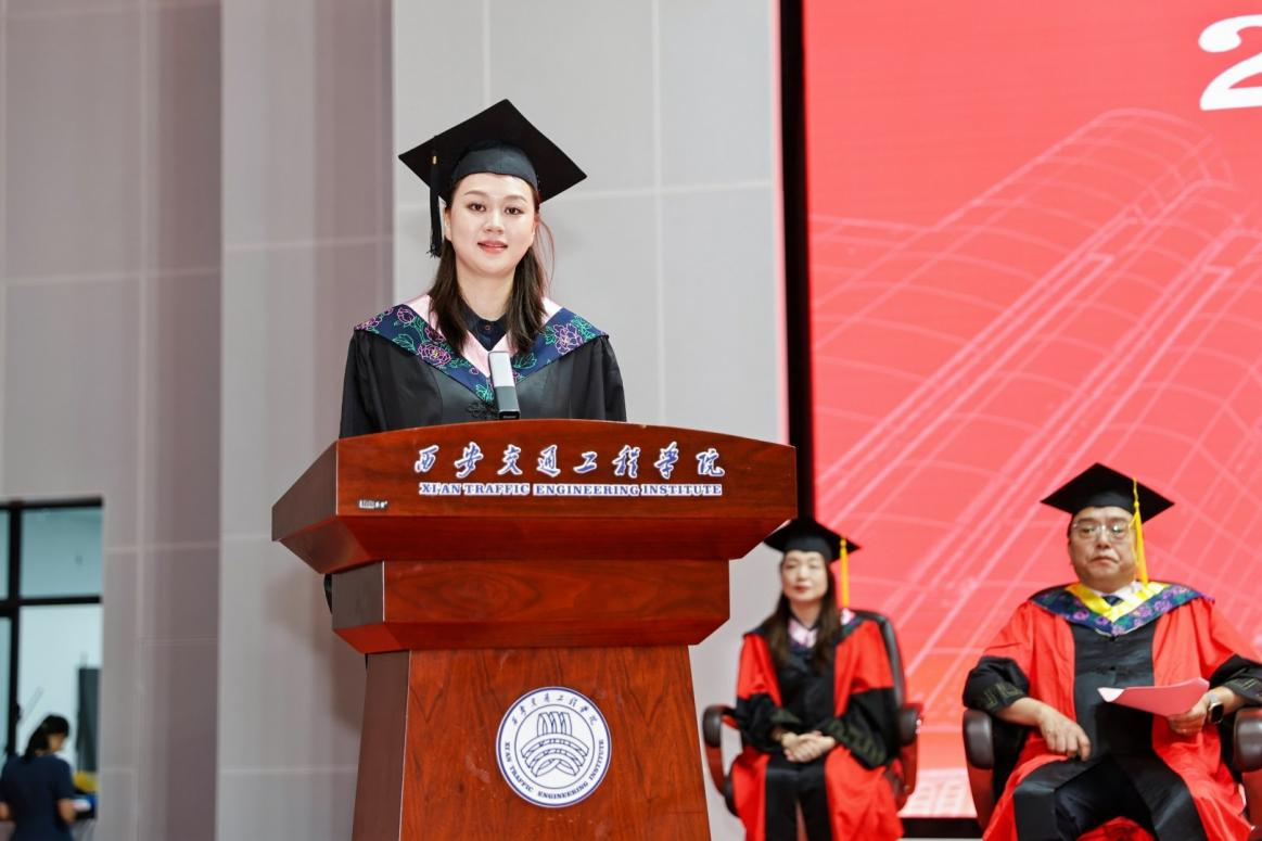 毕业生代表铁道工程学院杨晓璐同学真挚表达了对张晋生理事长、校领导、老师们和母校最真诚的敬意和谢意,回顾在校四年的奋发成长之路,对能与母校ky开元集团官网共同成长深感荣幸,学校“自强不息、修德载物″的校训精神将是他们受益终生的人生指导,是毕业生们人生未来发展和成就辉煌的不竭动力。她将于南京师范大学开启人生的下一程,号召ky开元集团官网学子不忘校训,以奋发之姿在祖国各地书写西交院人的新篇章。