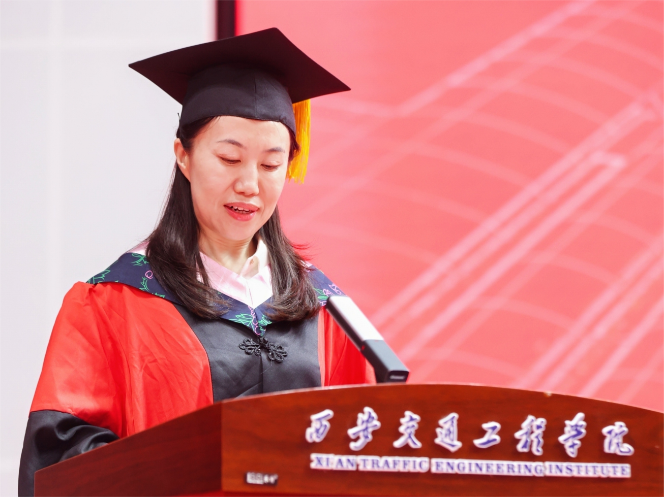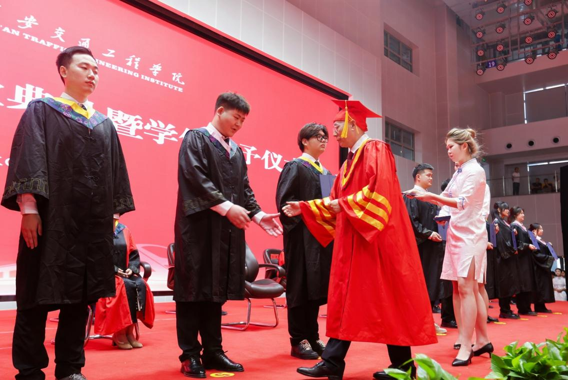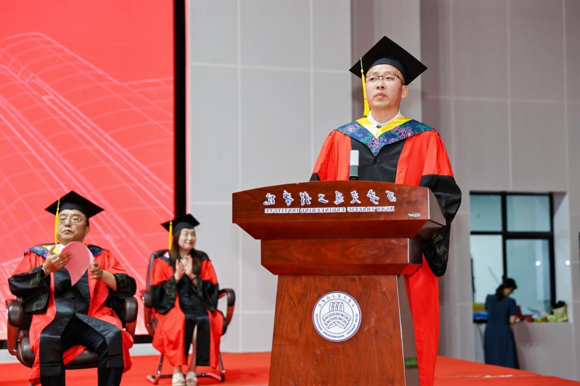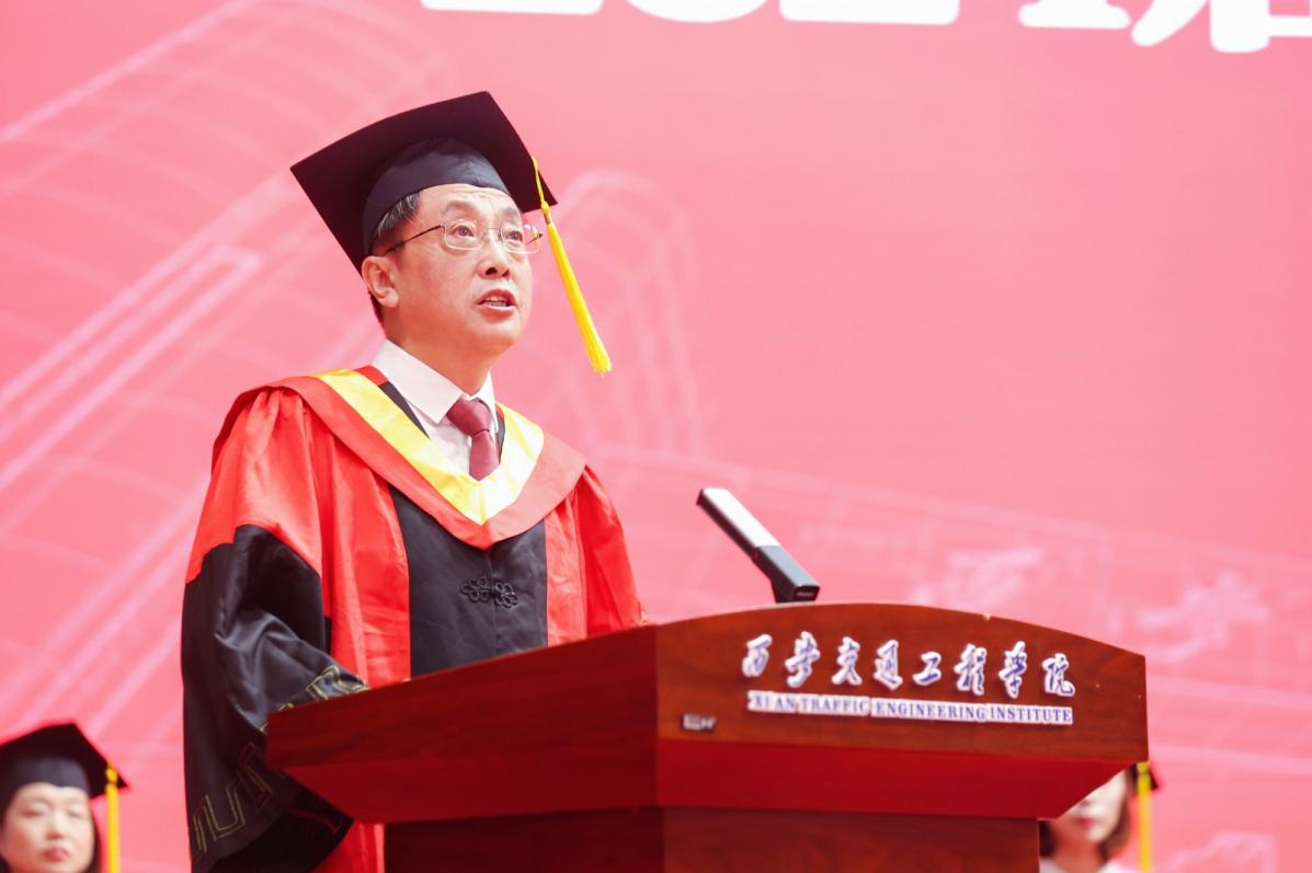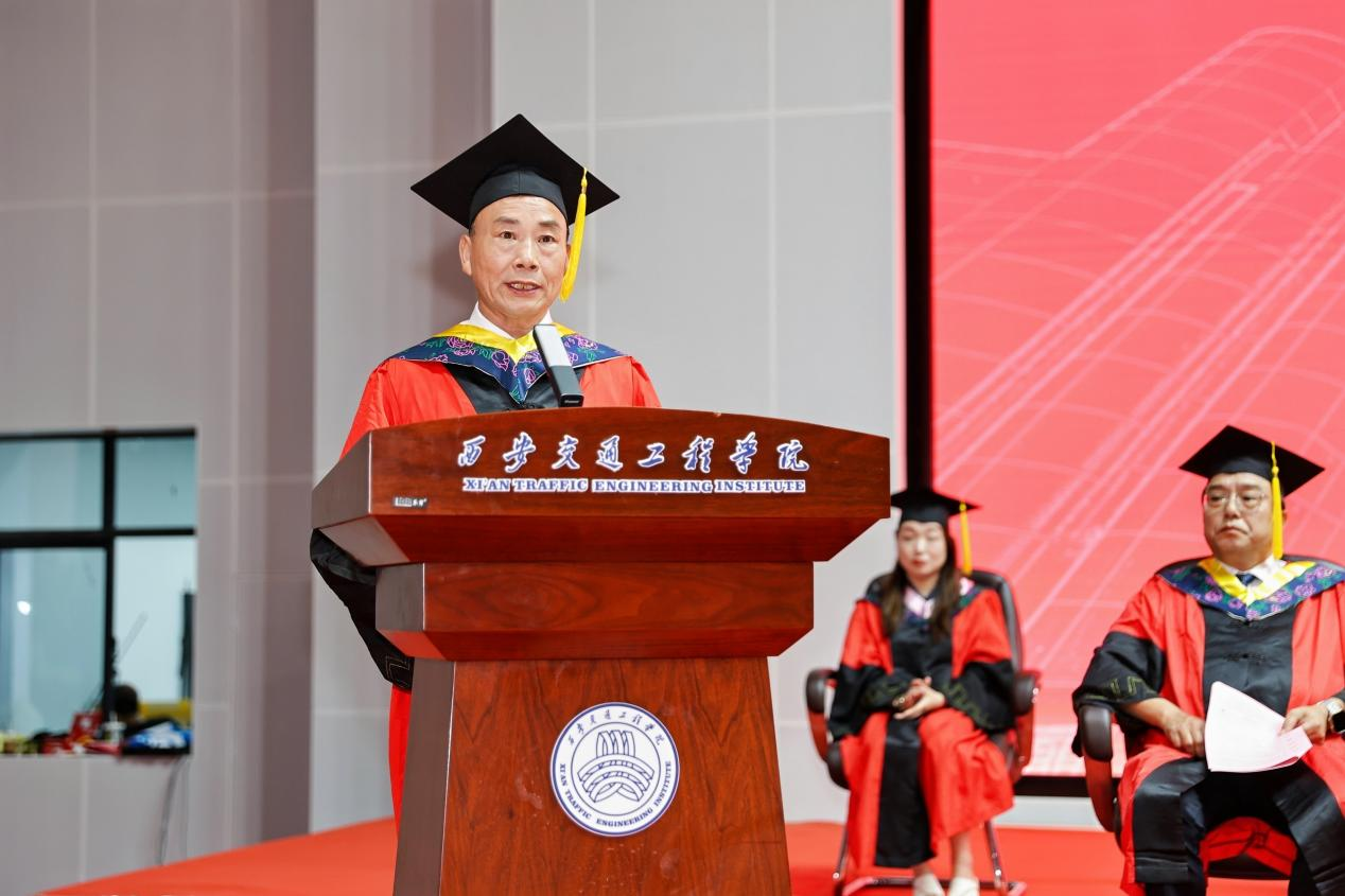教师代表常在斌教授对全体2024届毕业生表示真挚的祝福,并对毕业生提出了今后成长的指引和期许:一是筑牢信念根基,做爱国者。在各自未来的岗位心怀国之大者,将个人的成长和祖国的富强、民族的复兴紧密联系在一起。二是肩负使命担当,做传承者。秉承理事长张晋生同志融入西交院基因中“笃实惟新、负重图强、驰而不息、交通报国”的大学精神,勇担重任,书写属于西交院的时代光荣。三是常怀感恩之心,做奉献者。要身硬,扎得稳,靠得住,毫不犹豫地扛起责任,为国家富强、民族复兴、人民幸福和人类文明进步作出应有的贡献。