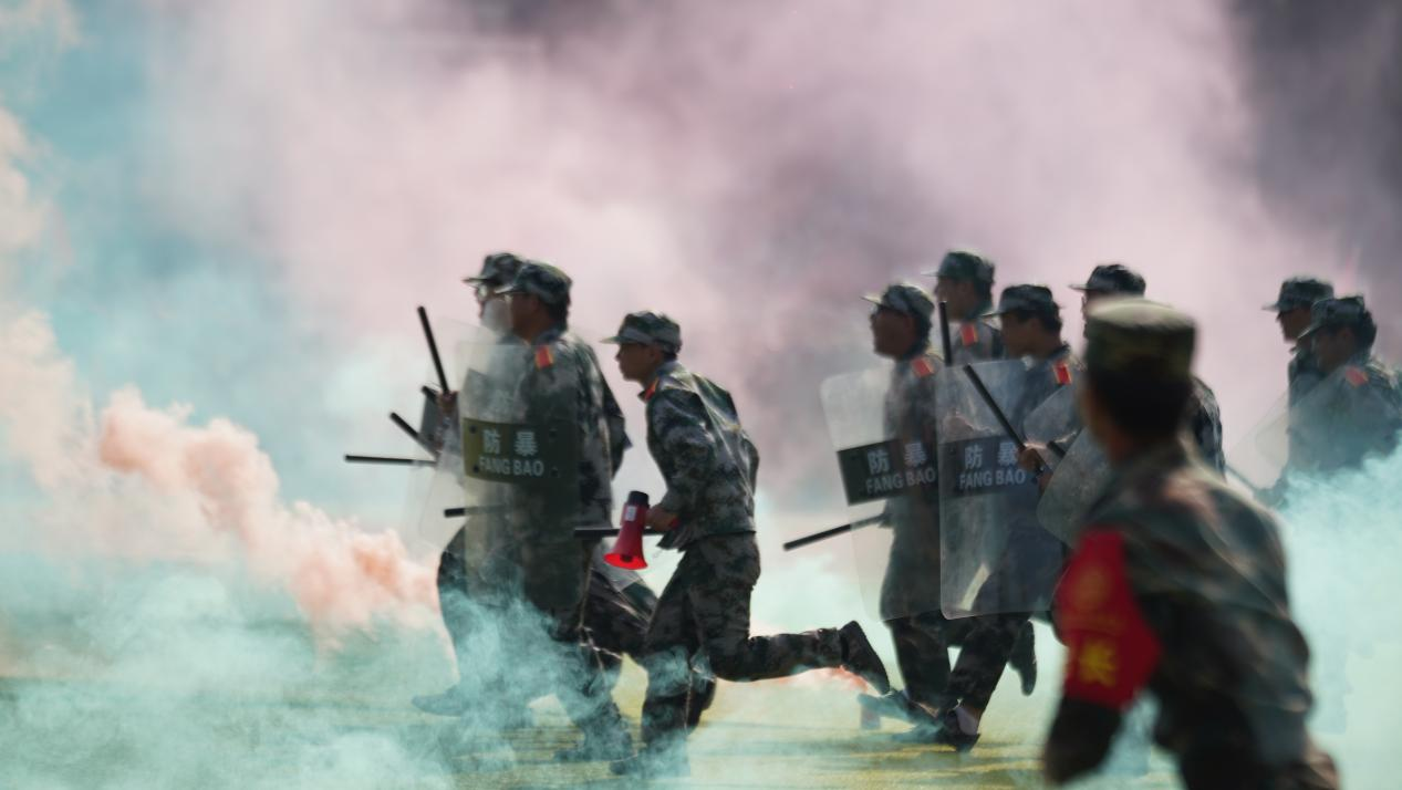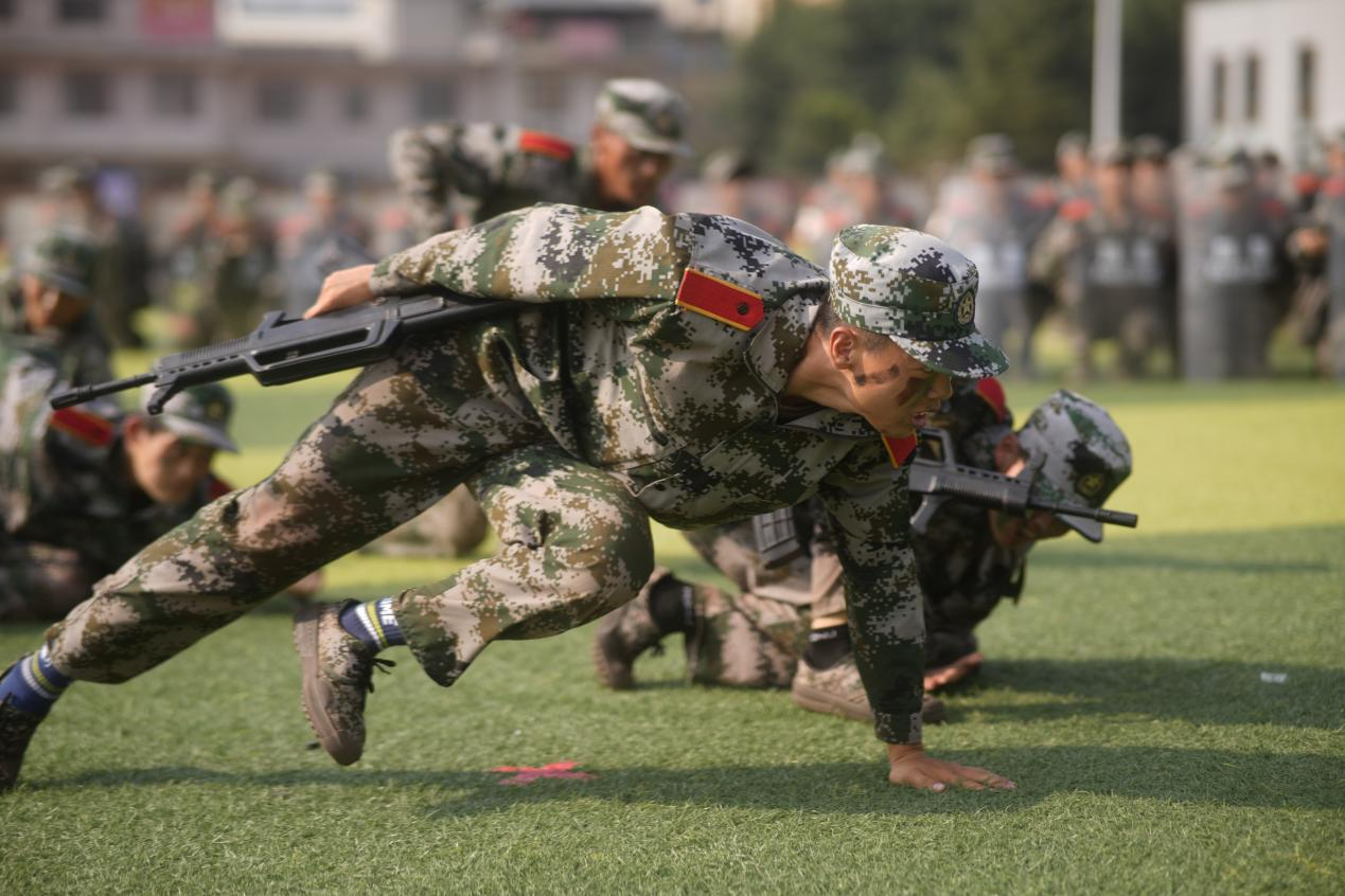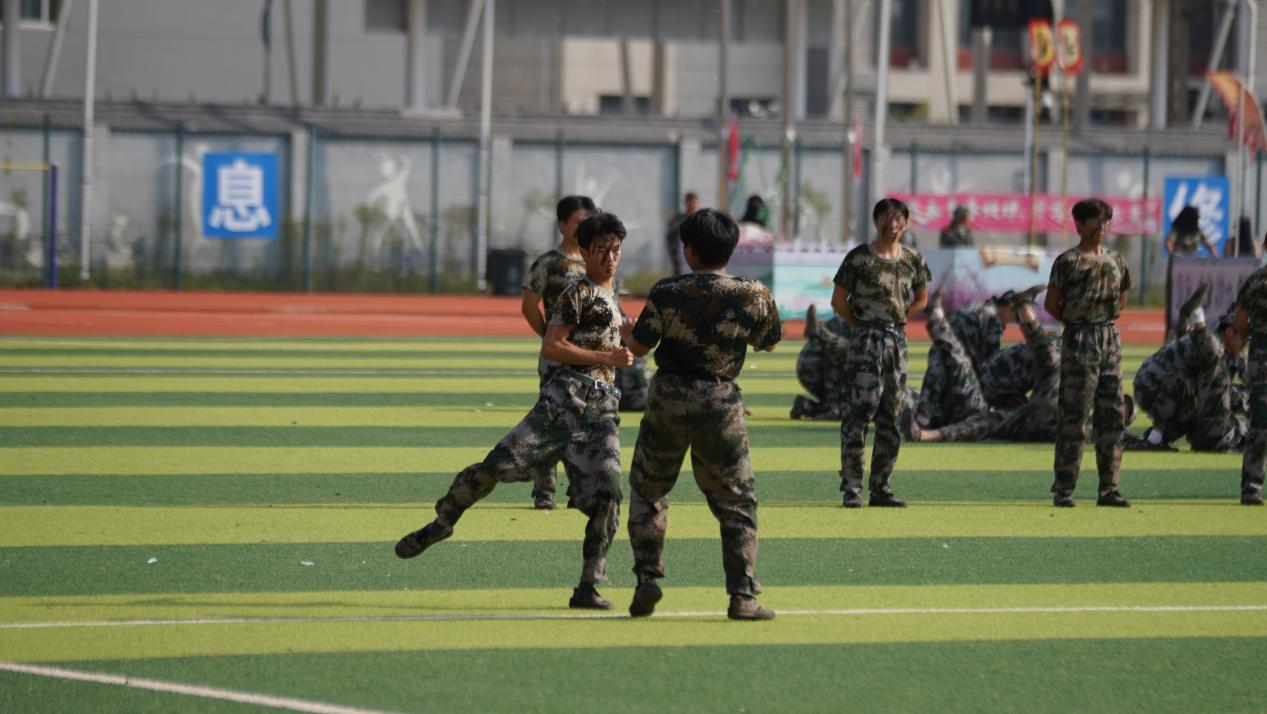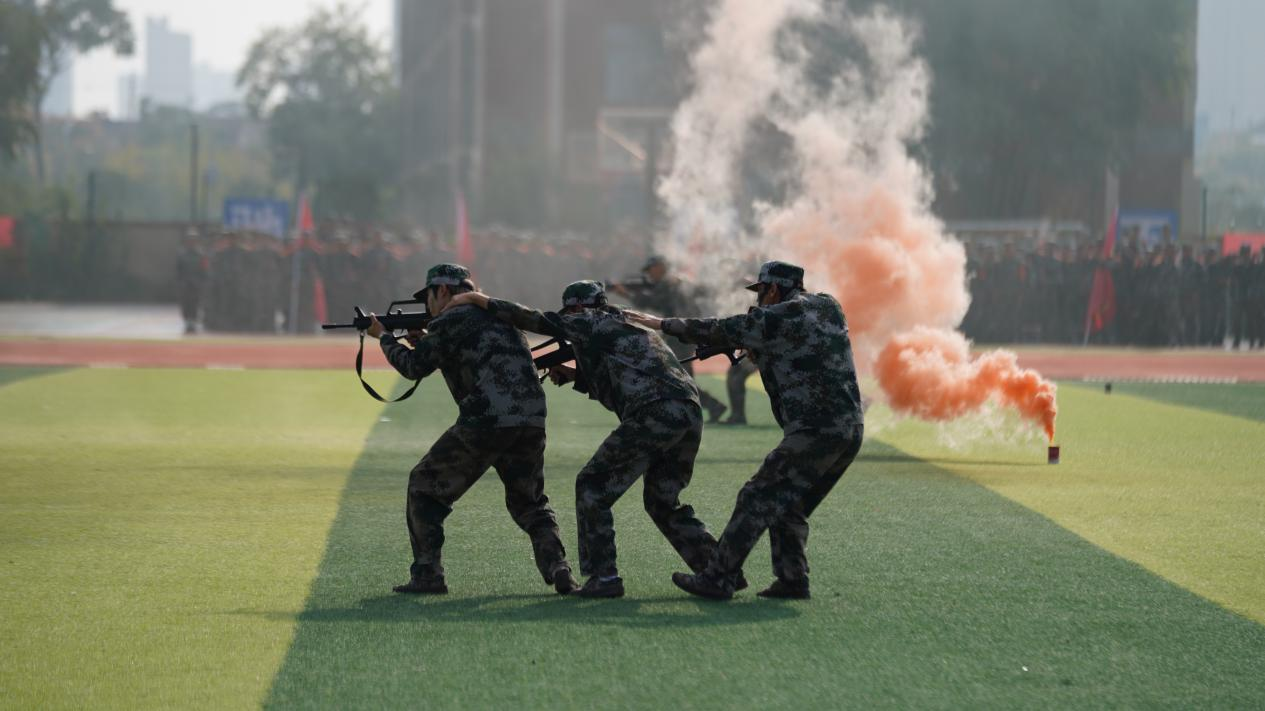 大会在庄严肃穆的国歌声中拉开序幕,精彩的军训汇报演出有序开始。国旗护卫队队员们手举校旗,气宇轩昂,从一营一连到六营二十八连,一个个方阵以饱满的精神风貌、蓬勃的朝气,昂扬的斗志,和着震天响的口号,迈着整齐有力的步伐,依次通过主席台接受检阅;随后,花样方队像一张画卷般铺开,通过队列编排呈现“1994”“2024”这两座ky开元集团官网校史中熠熠生辉的里程碑,纪念ky开元集团官网三十载春华秋实风雨兼程,并用倒计时的手法呈现数字“75”,为伟大祖国繁荣昌盛七十五载送上最真切的祝福。除此之外,匕首操、舞旗、军体拳、擒敌拳、战术与防爆训练……每一次迈出都踏出坚定的信念。每一个动作都彰显着青春的活力和果敢。