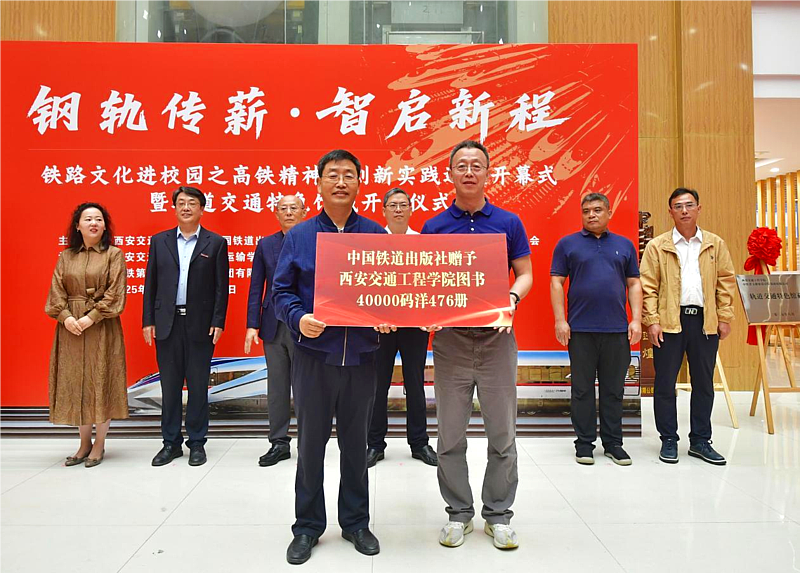 在全场嘉宾见证下,执行理事张慧与王智总经理共同为轨道交通特色馆藏揭牌。该馆藏由中铁第五勘察设计院集团捐赠,包含129册文献资料,系统记录安九高铁勘察、设计及施工全链条案例,涵盖鳊鱼洲长江大桥建设、生态保护等珍贵内容,为教学科研提供“原真性、全周期、高精度”的实践素材。曹庆年校长与中国铁路文联摄影分会秘书长刘之光为巡展剪彩。此外,中国铁道出版社向学校赠予一批铁路专业图书,副校长石广田代表学校接收赠书。
