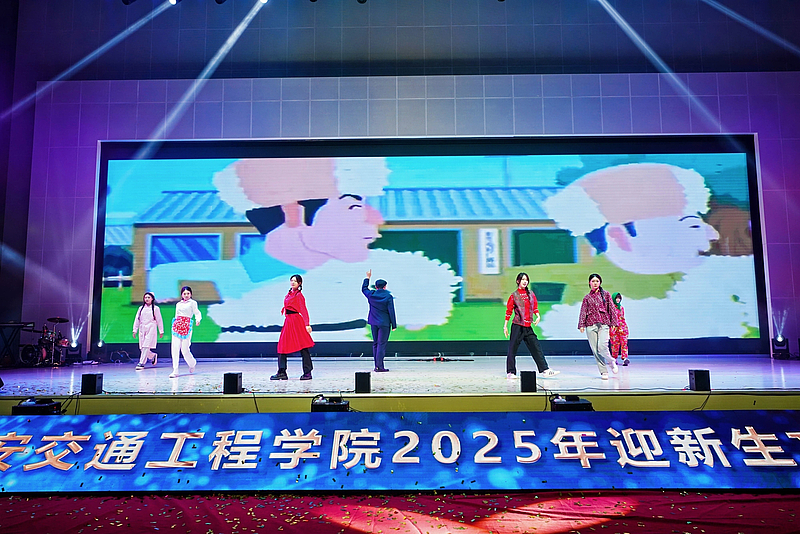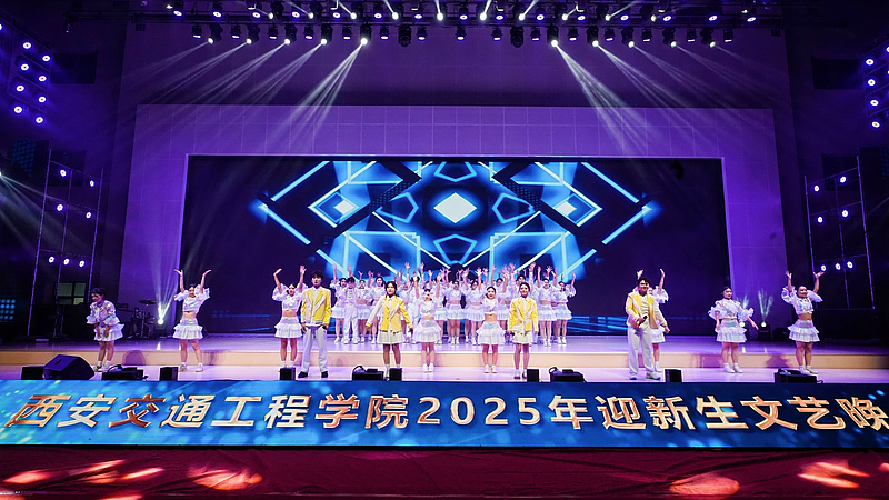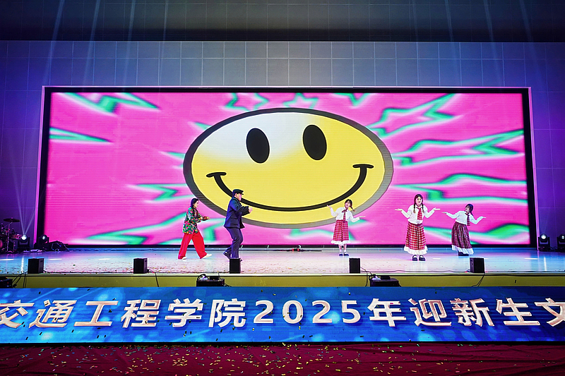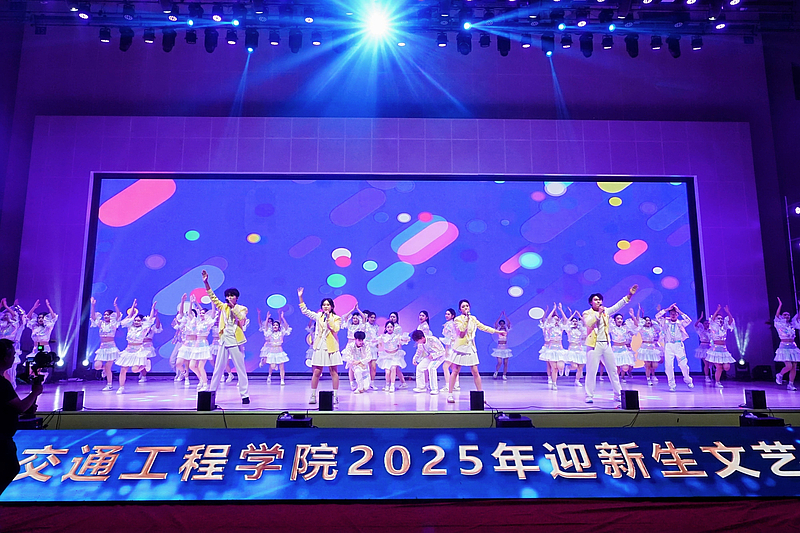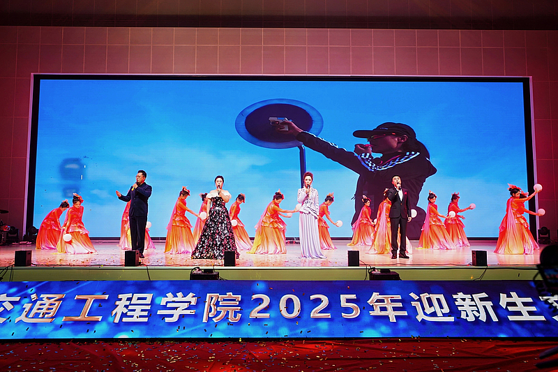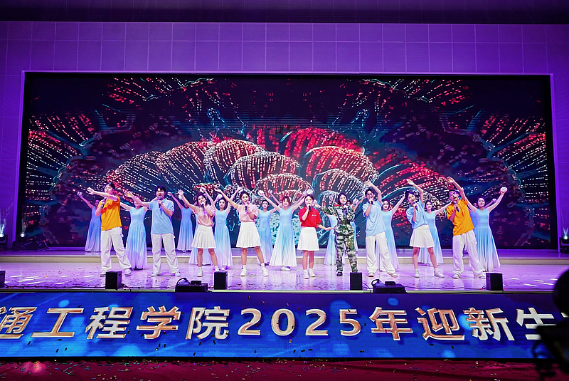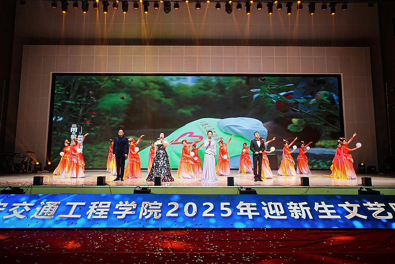 晚会在炫酷的灯光秀中拉开帷幕,随着阵阵烟花全体2025级新同学们的姓名“火力全开”,瞬间点燃全场气氛。大学生艺术团带来开场歌舞《我的未来不是梦》,激昂的歌声与充满活力的舞蹈相得益彰,表达了对新同学的美好祝愿。由宁慧、李文龙、路亮、李梦阳老师深情演唱、舞之韵民族社倾情伴舞的《道钉之光》,以铿锵之力展现了交院人坚韧不拔的精神品质;舞蹈《茉莉花开》,以优雅灵动的舞姿描绘出江南水乡的诗情画意,尽显传统韵味;大学生艺术团接连奉上充满力量的歌曲《是龙》和幽默十足的街舞《喜剧之王》,瞬间引燃现场,展现了青年学子的蓬勃朝气。