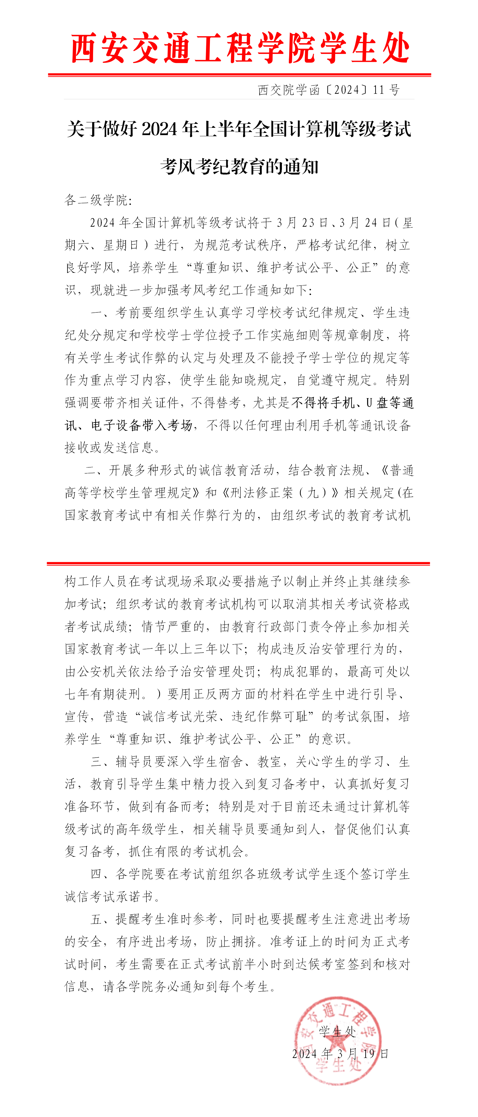关于做好2024年上半年全国计算机等级考试考风考纪教育的通知