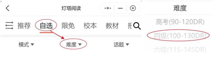 2.选择文章阅读,如果目标是四级建议可以进入“自选”栏目后选择“难度-四级”的文章阅读,如果目标是六级建议选择“难度-六级”的文章阅读。