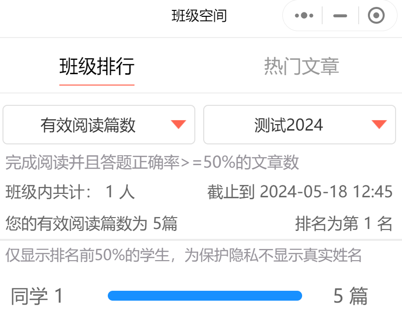 按活动期间加入活动班级同学的有效阅读篇数排名,有效阅读篇数多的排在前面。