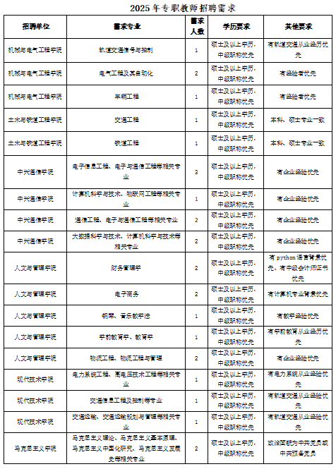 学校现有交通运输学院、机械与电气工程学院、中兴通信学院、土木与铁道工程学院、人文与管理学院、马克思主义学院、公共课部、创新创业学院、现代技术学院、继续教育学院10个教学单位。学校重视和加强大学文化建设,实施“文化铸校”战略,着力建设以精神文化、制度文化、行为文化和形象文化为基本内容的大学文化,不断提升大学文化品位,强化育人功能,彰显生机活力,为人才培养提供了良好的氛围和环境。
