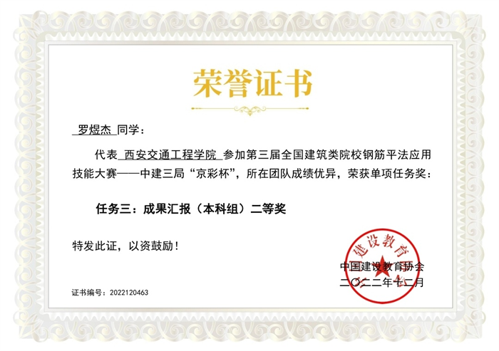 2022年12月,中国建设教育协会成功举办了第三届全国建筑类院校钢筋平法应用技能大赛—中建三局“京彩杯”全国总决赛,ky开元集团官网由土木工程学院教师曹会敏、刘龙刚指导,罗煜杰、苏润东、姜萌3名学生组成的“西交院梦三队”荣获全国总决赛本科组二等奖。