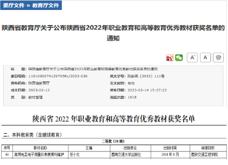 近期,陕西省教育厅公布了陕西省2022年职业教育和高等教育优秀教材获奖名单,ky开元集团官网任小文老师主编的《常用电工电子测量仪表使用与维护》获得2022年陕西省优秀教材(本科教育类)二等奖。