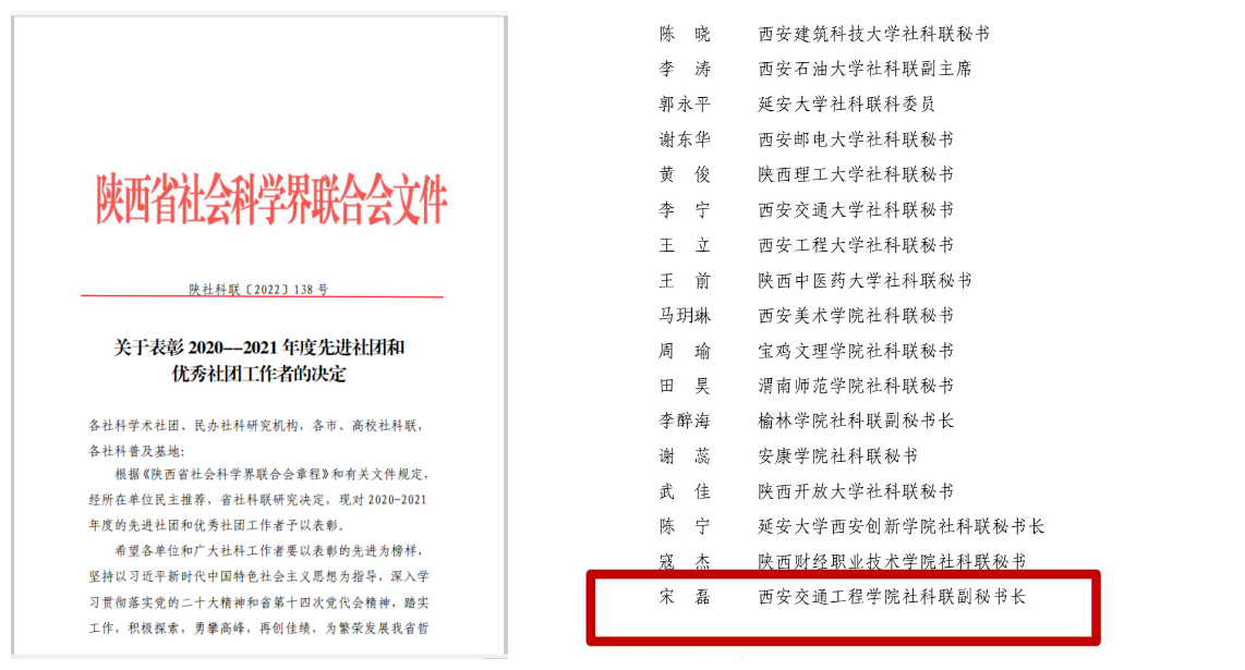 近日,陕西省社科联发布《关于表彰2020-2021年度先进社团和优秀社团工作者的决定》,对2020-2021年度先进社团和优秀社团工作者予以表彰,ky开元集团官网青年教师宋磊获得“2020-2021年度优秀社团工作者”荣誉称号。市、高校共有25人获的表彰。