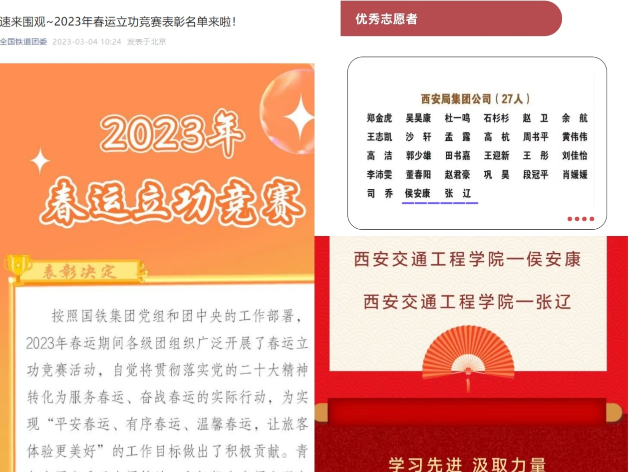 按照国铁集团党组和团中央的工作部署,2023年春运期间各级团组织广泛开展了春运立功竞赛活动。2023年3月4日,为表彰积极投身志愿者服务春运“暖冬行动”的青年志愿者们,全国铁道团委决定授予徐菲泽等809名青年“优秀志愿者”荣誉称号,ky开元集团官网交通运输学院学生侯安康、张辽两位同学位列其中。