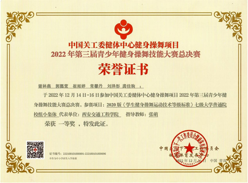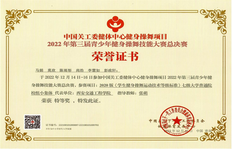 近日,2022年第三届青少年健身操舞技能大赛总决赛在青岛市城阳区闭幕。此次比赛共吸引了来自全国23个省市165个单位的500余支代表队的4500余名运动员、教练员、裁判员参赛。由张萌老师指导的马娟、莫欣、陈雨彤、尚浩、李慧如、彭政轩组成的参赛队荣获特等奖;由张萌老师指导的谢林燕、郭懿萱、崔雨婷、长馨丹、刘泽彤、龚佳驹组成的参赛队荣获一等奖。