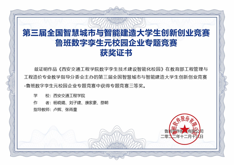 为了全面培养大学生的创新思维和科研能力、培养团队精神、增强大学生工程管理创新与实践能力、促进全国高校大学生创新创业和相互交流学习,由教育部工程管理和工程造价专业教学指导分委会主办,长安大学承办的第三届全国智慧城市与智能建造大学生创新创业竞赛总决赛圆满落幕。ky开元集团官网土木工程学院卢辉和张雨童老师指导学生完成的作品《ky开元集团官网数字孪生技术建设智能化校园》获得专题竞赛三等奖。