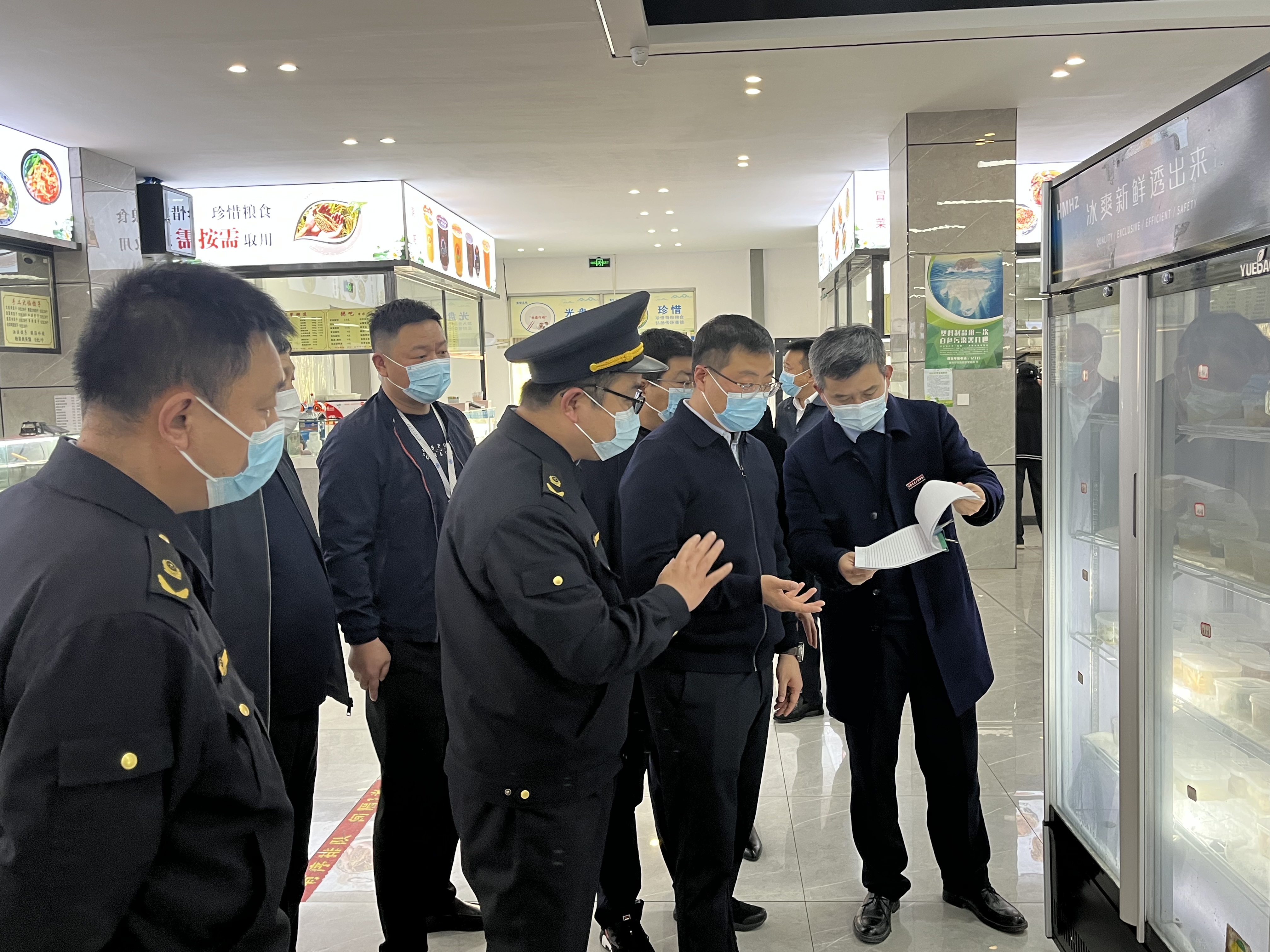 2023年3月29日,西安市鄠邑区区长汪国栋、副区长崔科峰及区市场监管局局长沈军胜一行莅临ky开元集团官网检查指导食品安全工作。ky开元集团官网副校长赵征、餐饮服务中心主任武小红老师陪同。