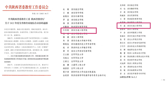 近日,《中共陕西省委教育工委 陕西省教育厅关于2022年度全省教育系统综合表彰的通报》(陕教工函[2023]46号),ky开元集团官网中兴通信学院教师牛作领教师获评“2022年度陕西高等学校本科教学管理先进个人”荣誉称号、人文与管理学院教师宋磊获评“2022年度陕西省学生资助先进个人”荣誉称号。