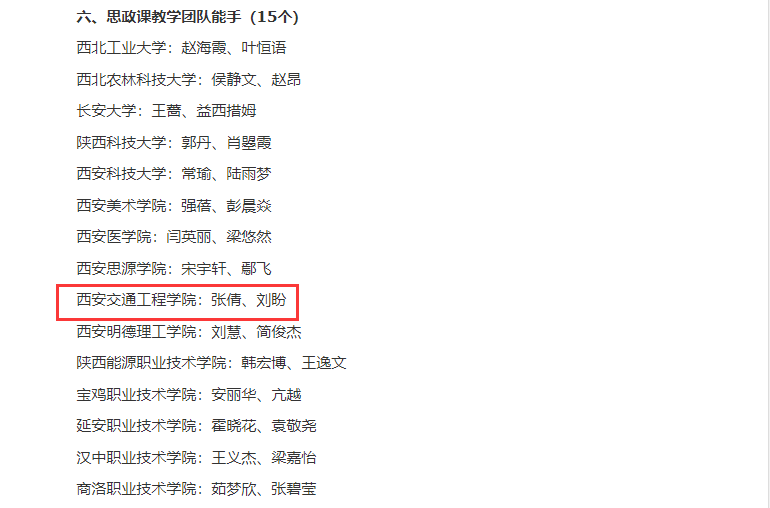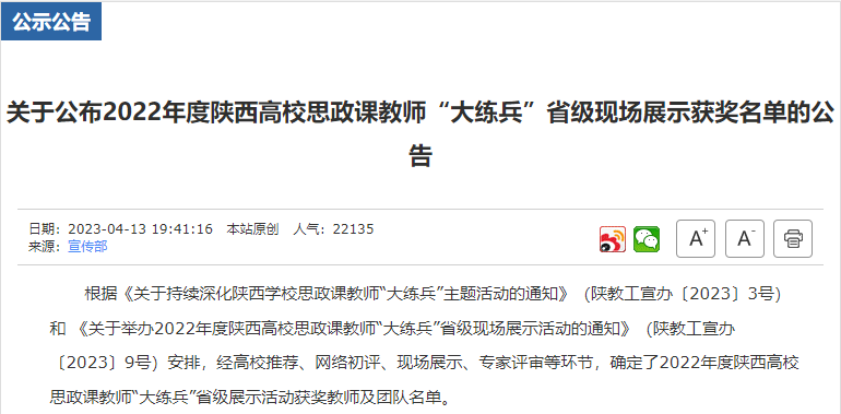 根据《关于持续深化陕西学校思政课教师“大练兵”主题活动的通知》和 《关于举办2022年度陕西高校思政课教师“大练兵”省级现场展示活动的通知》\安排,经高校推荐、网络初评、现场展示、专家评审等环节,ky开元集团官网马克思主义学院思政课教学团队张倩、刘盼喜获2022年度陕西高校思政课教师“大练兵”思政课教学团队能手荣誉称号。