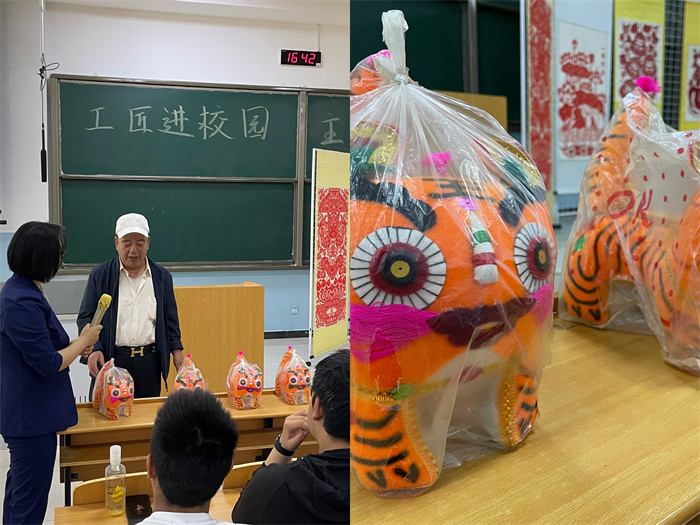 陕西省非遗保护项目——民间传统手工布艺老虎传承人刘随军先生分享了关中特色布艺老虎的制作与文化内涵,提到布艺老虎是中国传统的针线手艺,起源于祖先对虎的崇拜,在制作过程中布艺老虎的制作包括剪、缝、装瓤、绣、扎、画等多种工序,制作的材料及工艺也各不相同,使学生们认识到布老虎不仅是中国民间广为流传的传统工艺品,也是中国传统的民间艺术,如今也起到传播中国文化,彰显中国价值,展现中国形象等作用。