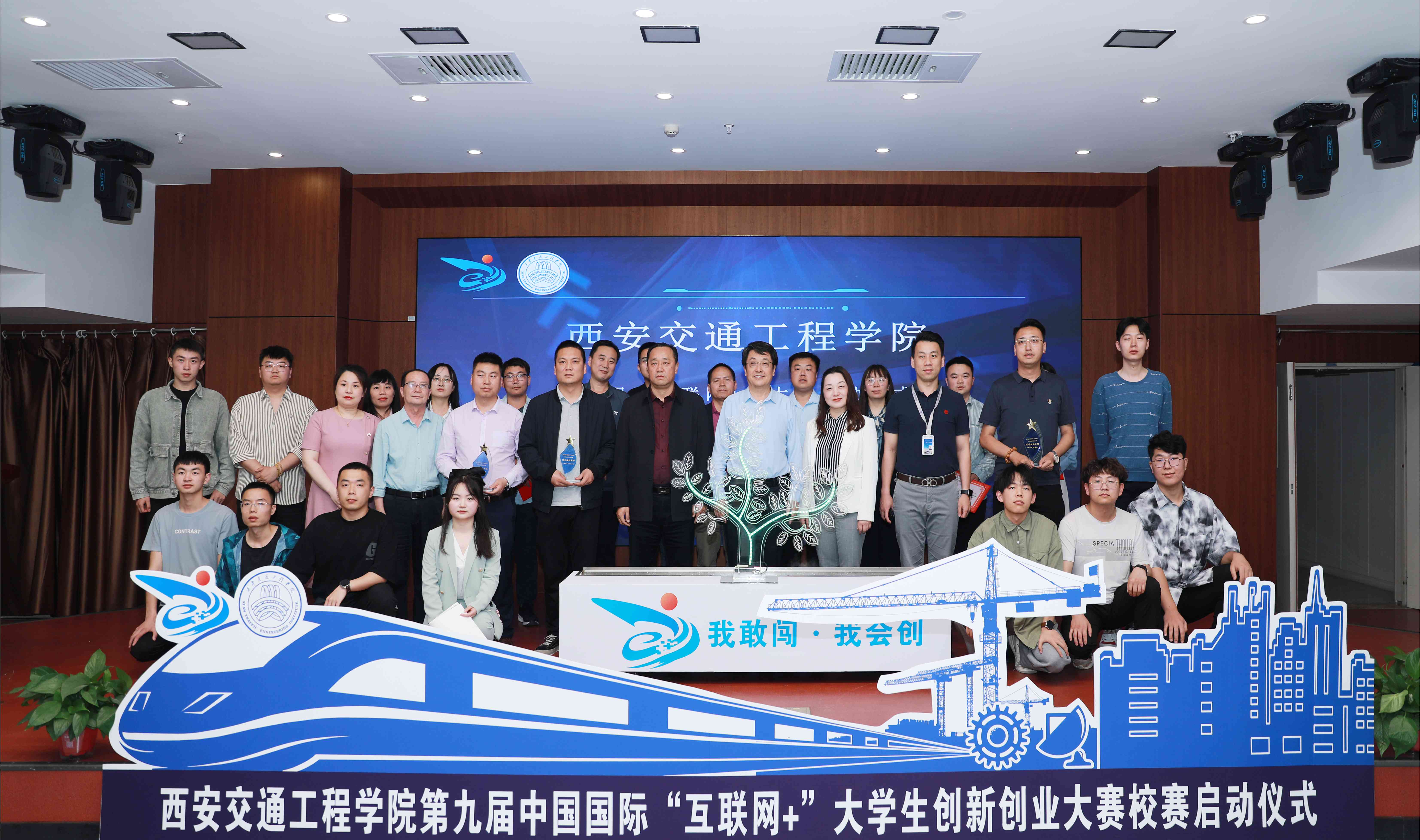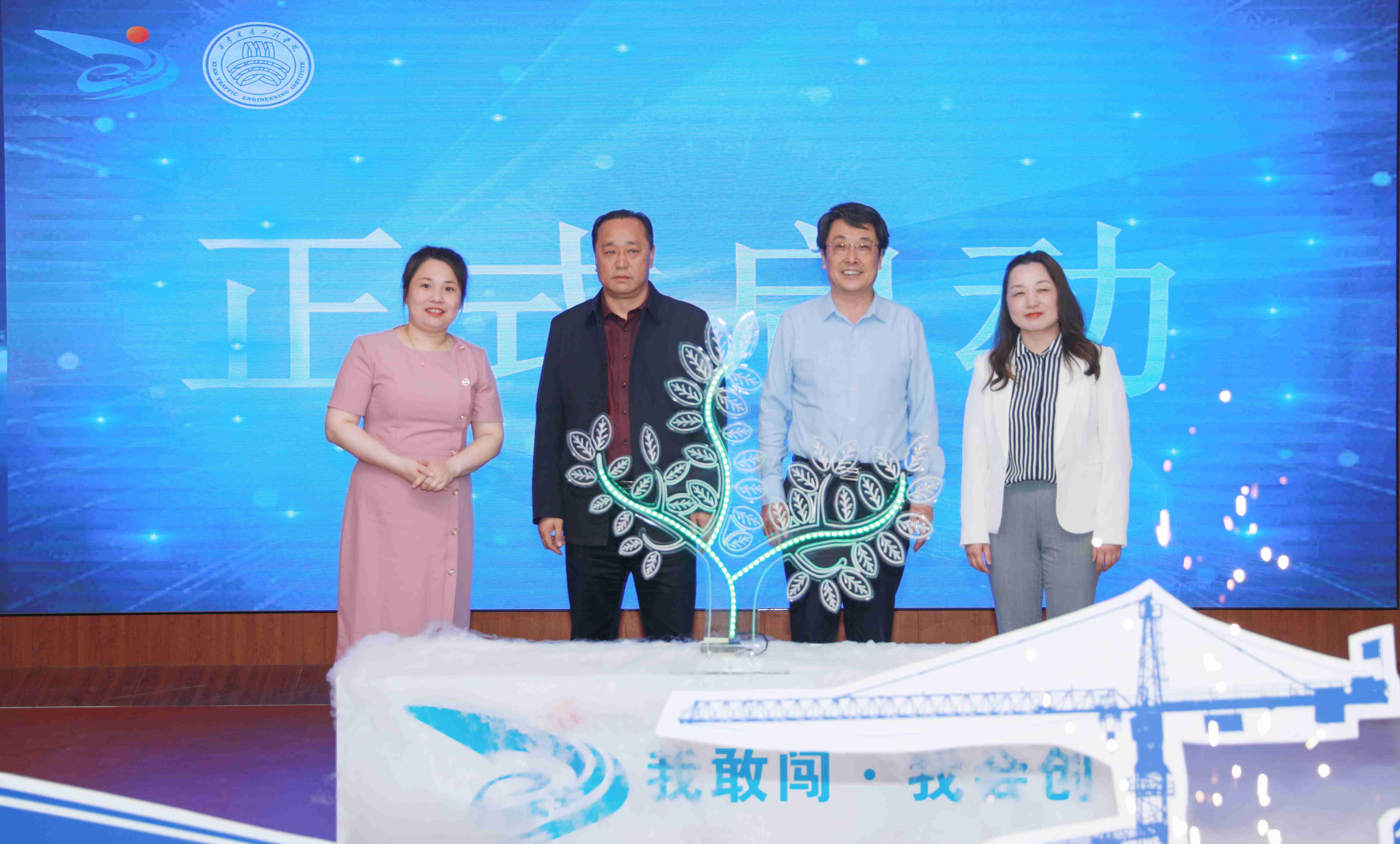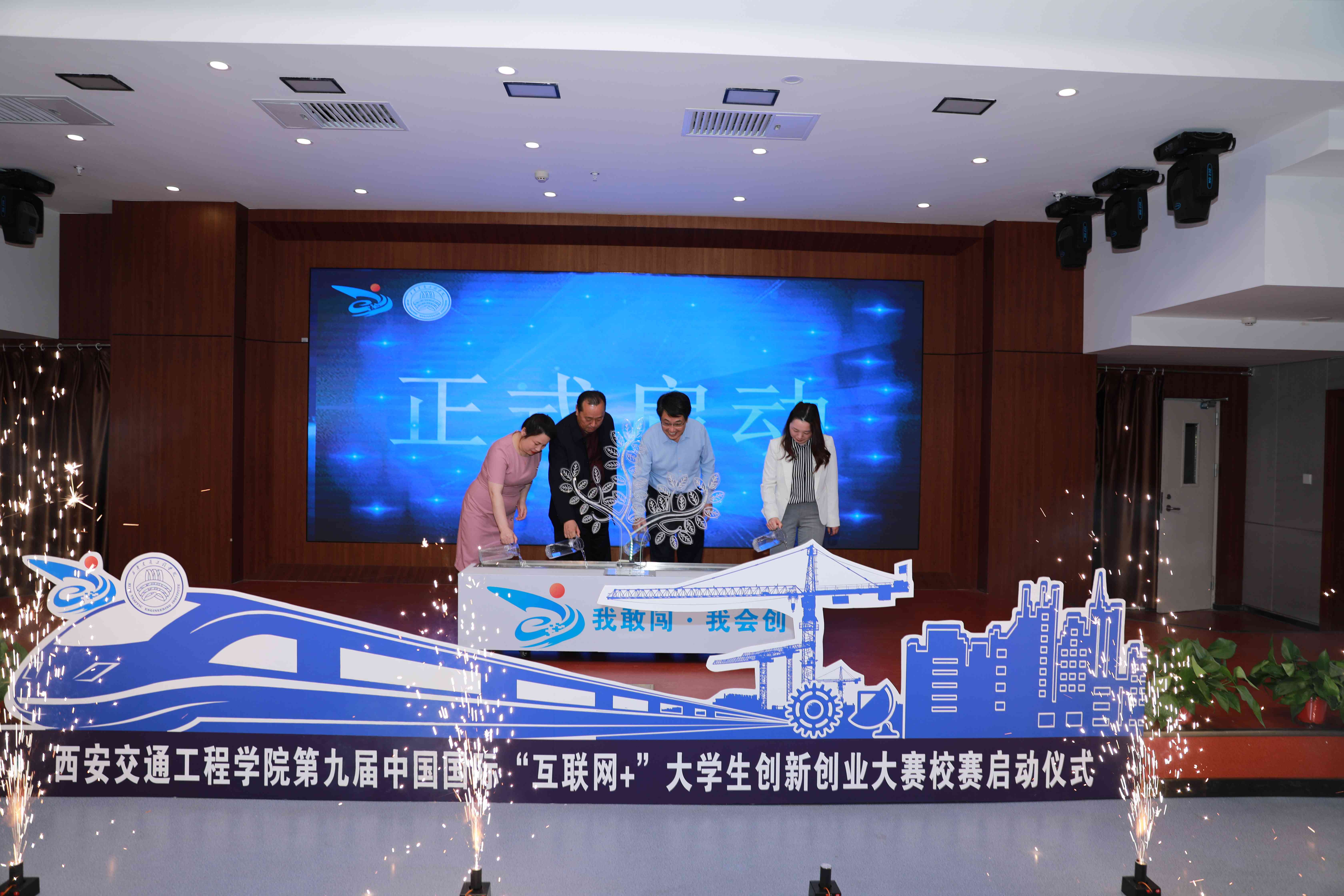 执行校长曹庆年宣布第九届“互联网+”大学生创新创业大赛正式启动。执行校长曹庆年、副校长王勇、校长助理潘春辉、创新创业学院副院长屈茹以共同浇灌象征着交院学子创新创业精神的智慧之树来开启本次大赛。