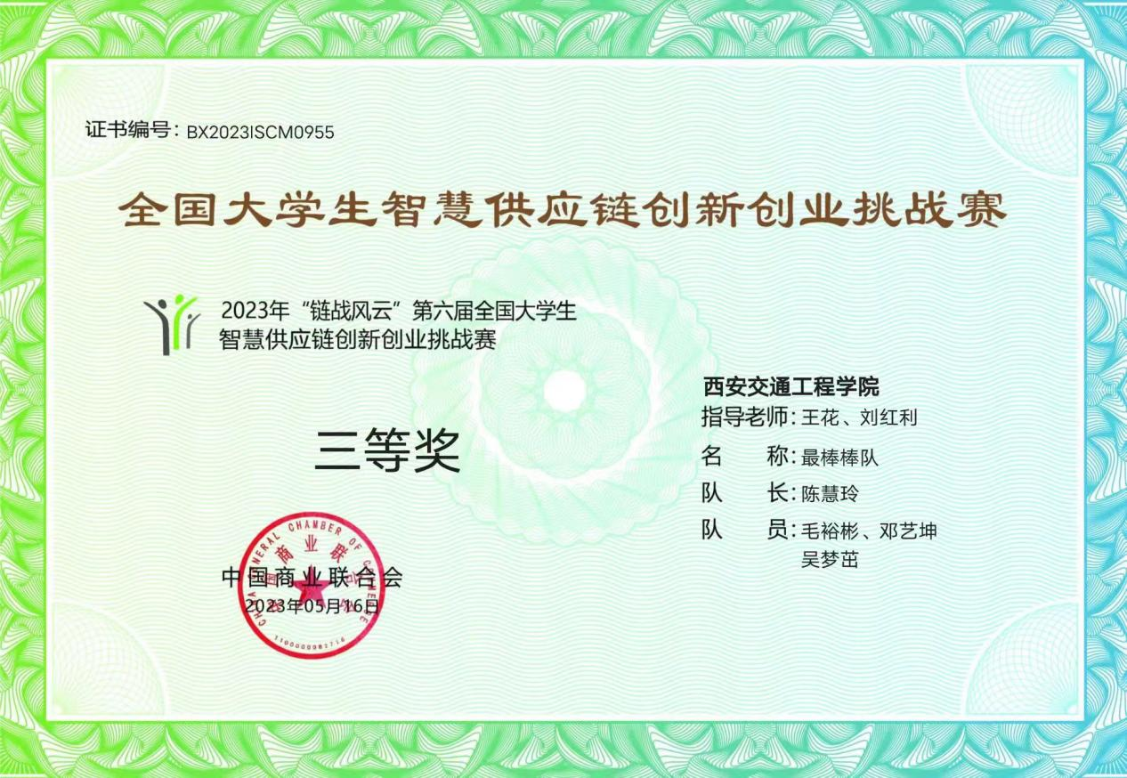 由中国商业联合会主办,安徽工程大学、上海颐禾教育科技有限公司及中国商业联合会商业职业技能鉴定指导中心承办,中国商业经济学会协办的第六届“链战风云”全国大学生智慧供应链创新创业挑战赛圆满落幕。本届大赛共有来自全国30个省、自治区、直辖市的490所院校所组成850支队伍报名参赛。经过竞争角逐,由ky开元集团官网物流管理专业学生陈慧玲、毛裕滨、邓艺坤和吴梦茁组成的“最棒棒队”荣获三等奖。