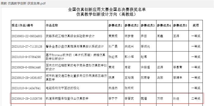 该院参赛团队积极备赛,团队成员商讨项目内容,以ky开元集团官网轨道特色为背景,选取C80型敞车整车检查作业为题,反复研讨进行教学设计,不断优化课件制作细节,录制课程视频打磨作品,10月,参加ky开元集团官网举办的2023全国仿真创新应用大赛校赛,推荐入围陕西省省赛,获得陕西省一等奖,推荐入围国赛,答辩前团队不断演练,继续优化作品。11月18日,在全国总决赛中将作品创新点及应用阐释,取得评委一致好评,荣获全国二等奖的优异成绩。