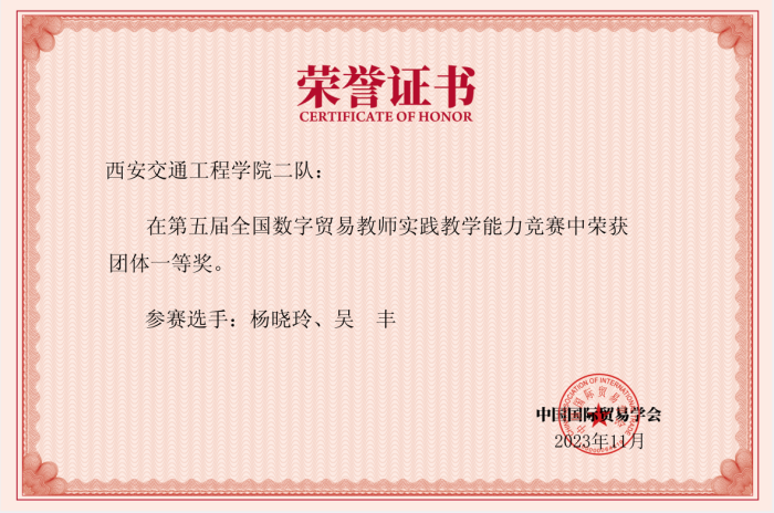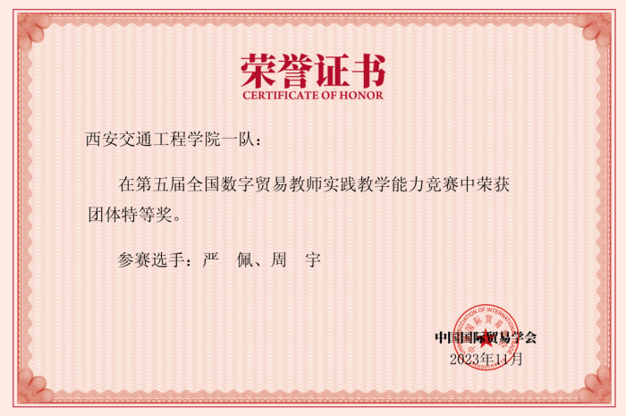 在第五届全国数字贸易教师实践教学能力竞赛中,ky开元集团官网人文与管理学院电子商务教研室教师严佩、周宇、杨晓玲、吴丰四位老师取得了显著成绩,荣获团体特等奖和团体一等奖。