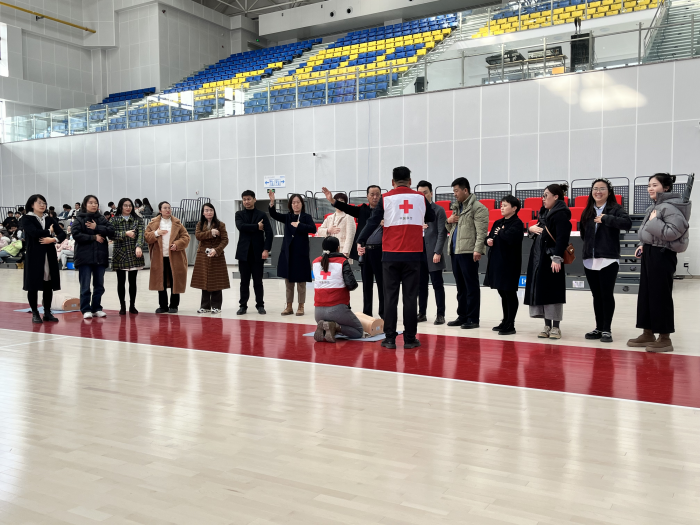 红十字应急培训师杨阳以“发生意外时,我们敢救、会救吗”引发师生思考,并着重讲解了心搏骤停发生的常见原因、经典案例、AED的使用、现场心肺复苏的程序及操作技术。此外,还科普了“心肺复苏”的抢救黄金时间,强调了现场救护的紧急性、实效性与重要性。讲解完成之后,现场的老师和学生积极进行模拟演练,基本掌握了心肺复苏操作和常见的现场急救处理方法。