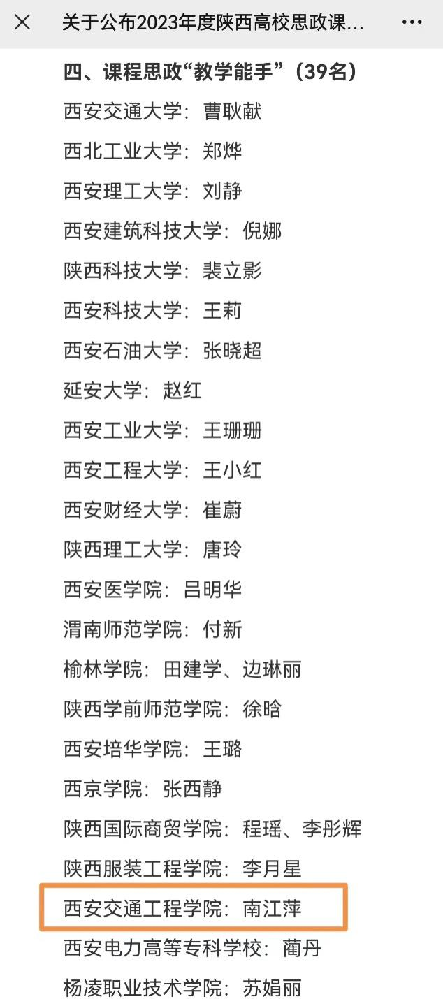 根据《关于开展2023年度陕西学校思政课教师 “大练兵”省级展示活动的通知》(陕教工宣办〔2023〕33号)和《关于举办2023年度陕西高校思政课程课程思政教师“大练兵”省级现场展示活动的通知》(陕教工宣办〔2023〕35号)安排,经高校推荐、网络初评、现场展示、专家评审等环节,陕西省教育厅于2023年12月22日确定了2023年度陕西高校思政课程课程思政教师“大练兵”省级展示结果,其中,ky开元集团官网机械与电气工程学院电气工程教研室南江萍老师荣获省级“教学能手”称号。