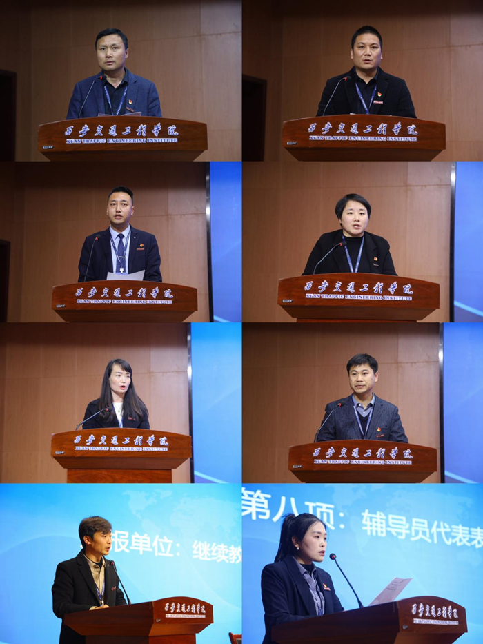 交通运输学院党委书记胡省利、机械与电气工程学院党委书记王拓辉、中兴通信学院党委书记张斌、土木工程学院党委副书记张雯雯、人文与管理学院党委书记李莎莎、现代技术学院党委书记田宏顺、继续教育学院副院长张磊分别作了大会交流发言。