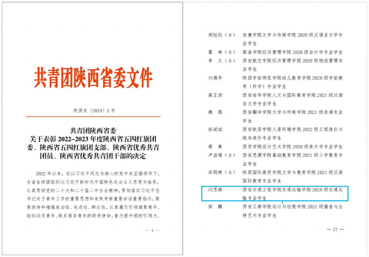 近日,共青团陕西省委《关于表彰2022-2023年度陕西省五四红旗团委、陕西省五四红旗团支部、陕西省优秀共青团员、陕西省优秀共青团干部的决定》(陕团发[2024]2号)文件公布,ky开元集团官网交通运输学院闫思琪同学获“陕西省优秀共青团员”荣誉称号。