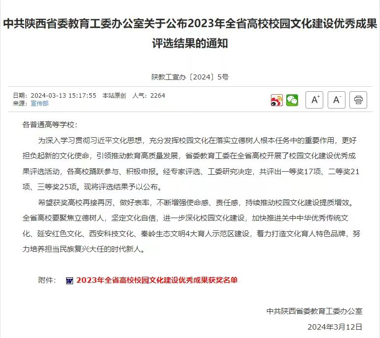 近日,中共陕西省教育工委公布了2023年全省高校校园文化建设优秀成果评选结果,由ky开元集团官网党委宣传部牵头组织,学生处具体申报的《依托“户县农民画”打造地域特色校园文化》项目荣获三等奖。
