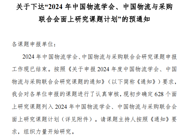 4月11日,中国物流学会、中国物流与采购联合会公布了《关于下达“2024年中国物流学会、中国物流与采购联合会面上研究课题计划”的预通知》,ky开元集团官网物流管理教研室申报的两项目喜获立项。
