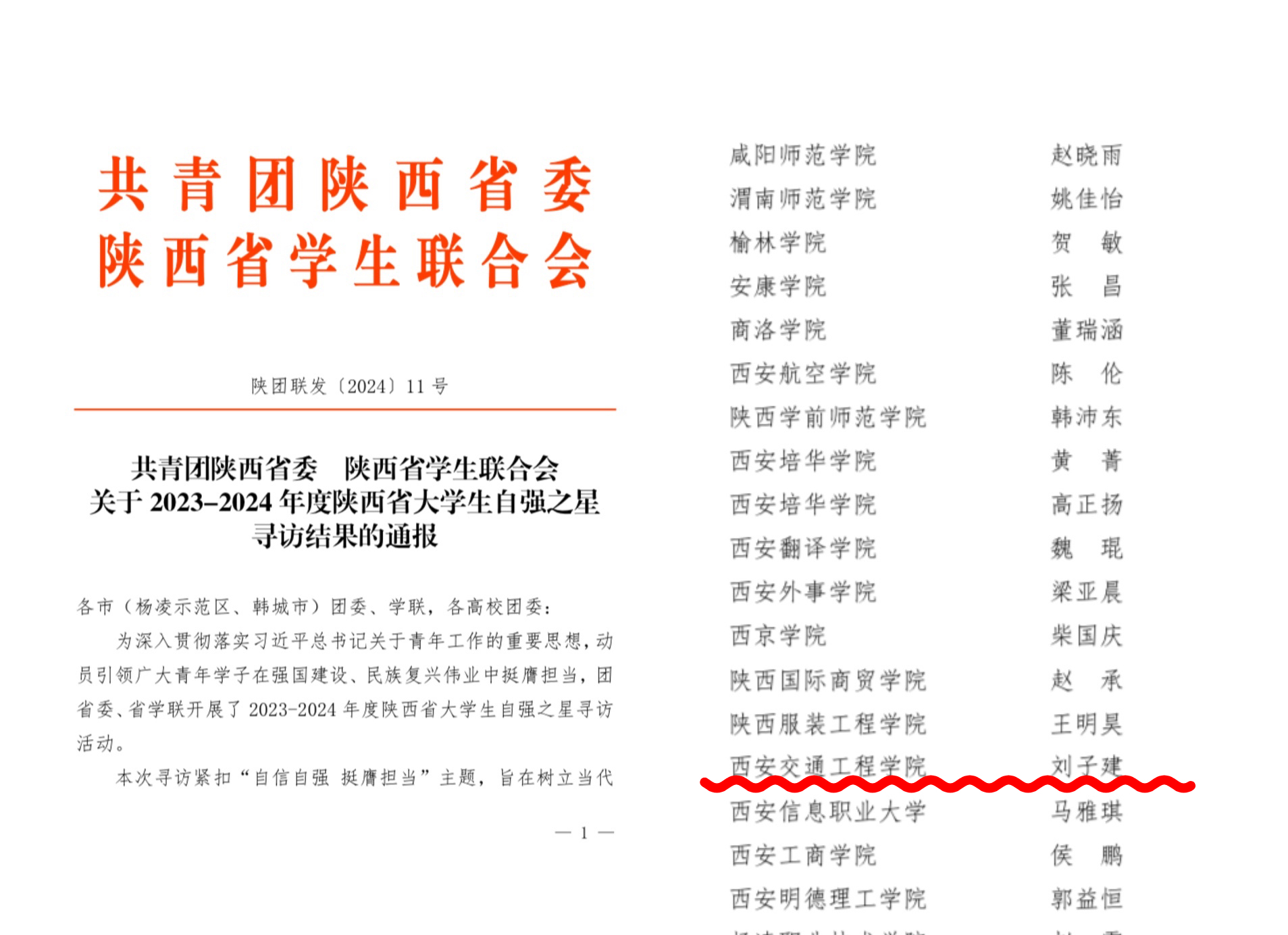 近日,由共青团陕西省委、陕西省学生联合会举办的2023-2024年度“陕西省大学生自强之星”活动寻访结果正式揭晓,校团委推荐的土木工程学院刘子建同学荣获“陕西省大学生自强之星”称号。