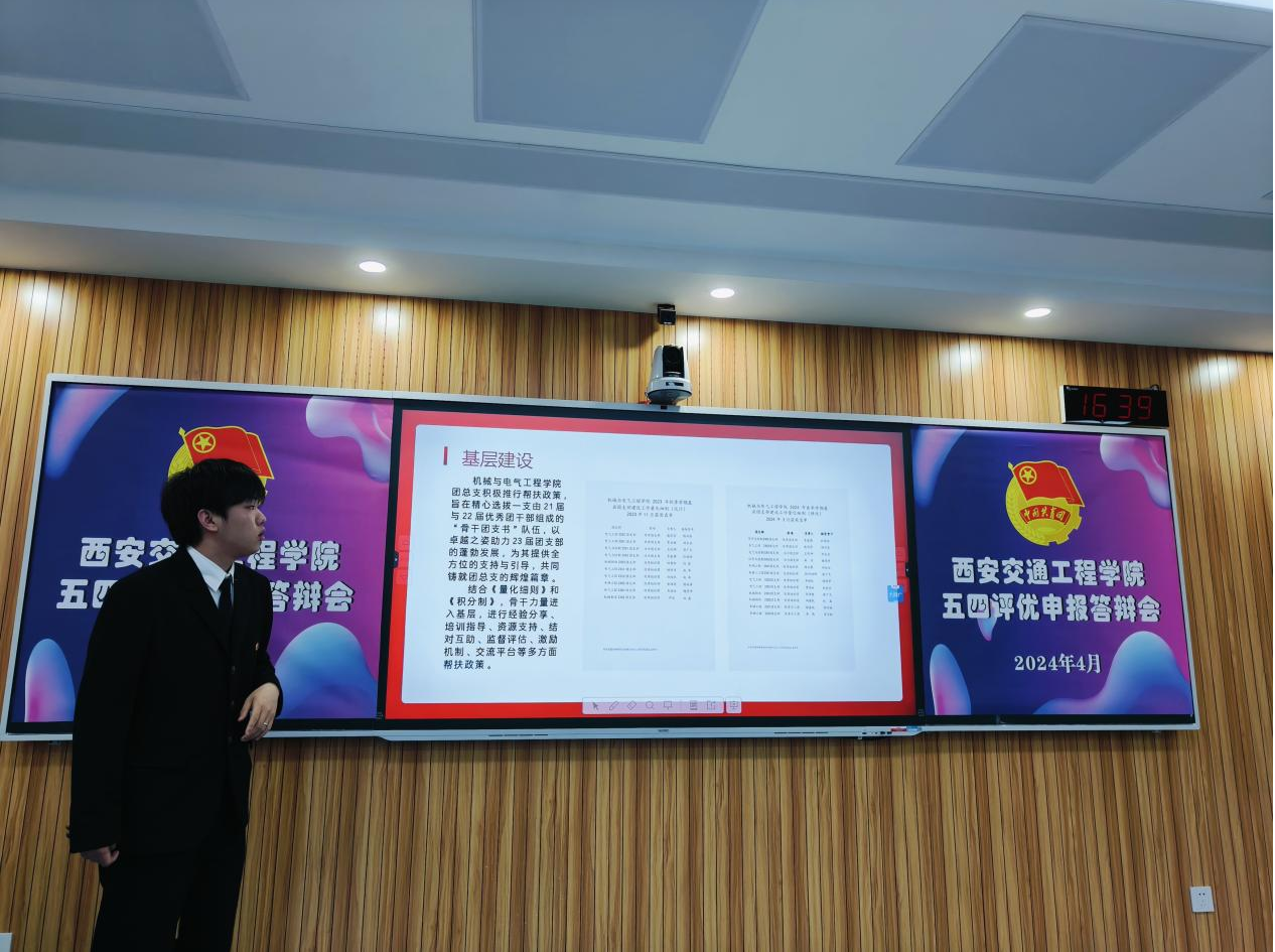 本次“五四评优”答辩项目包含阳光团总支、优秀学生组织基层组织建设先进单位、加强校园文化建设先进单位、新媒体与网络宣传先进单位、志愿服务与社会实践先进单位等。各参评单位按照抽签顺序,通过PPT的展示形式围绕基层组织建设、校园文化活动、突出业绩成果、学校(社会)影响力等方面进行5-8分钟汇报答辩。答辩采用团总支书记互评占比(30%)+学生代表评选占比(10%)+日常工作表现占比(20%)+答辩评审(团委工作人员+党政领导)占比(40%)综合评定。