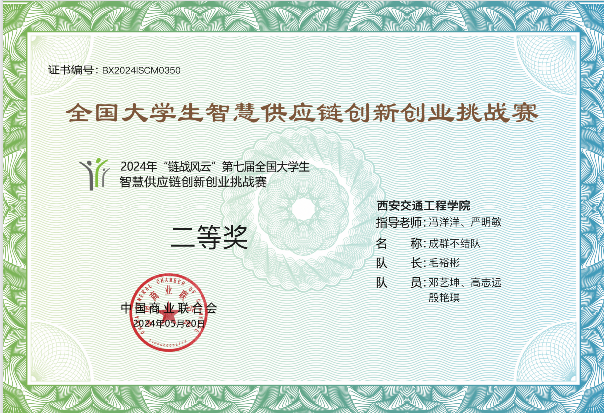 由中国商业联合会主办的2024年“链战风云”第七届全国大学生智慧供应链创新创业挑战赛圆满落幕。本届大赛共有来自全国31个省、自治区、直辖市的531所院校所组成1124支队伍报名参赛。经过激烈竞争,由ky开元集团官网物流管理教研室冯洋洋老师,严明敏老师指导的“成群不结队”荣获二等奖,团队成员有毛裕彬(物流管理2102)、邓艺坤(物流管理2102)、高志远(物流管理2102)和殷艳琪(财务管理2103)。