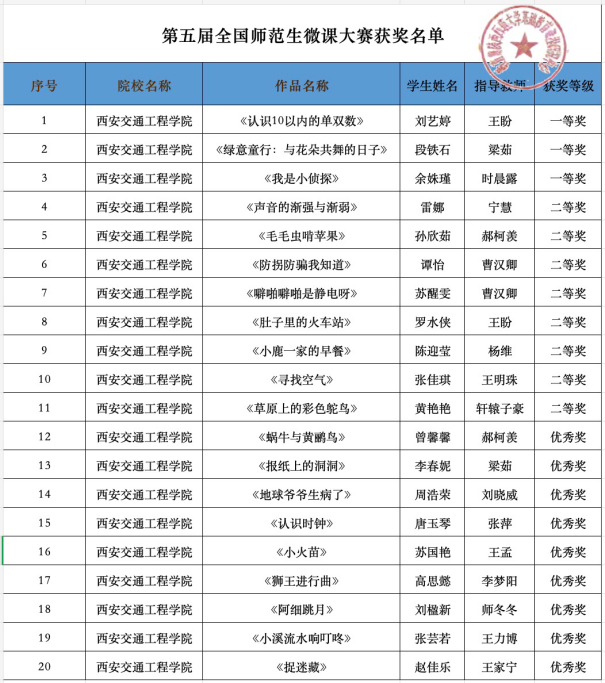 为了提高师范生的信息化教学能力和实践创新能力,加快创新型卓越教师的培养。近日,由教育部主办、教育部陕西师范大学基础教育课程研究中心和西北教师教育联盟联合承办的全国师范生微课大赛举行。ky开元集团官网学前教育和音乐教研室积极组织、悉心指导学生参加“第五届全国师范生微课大赛”,获得全国一等奖3个、二等奖8个、优秀奖9个的好成绩。