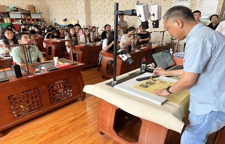 王其祎教授以“以小见大”的开场白,将主题从单一的文创产品引向西安碑林博物馆,接着对古代文献典籍和石刻图案等文化瑰宝进行详细介绍。随后对ky开元集团官网师生的书画作品进行深入分析和讲解,通过书写演示与口头讲解同步向大家展示同字异体所带来的美感,并与现场同学们深入探讨了书法中的笔法,向大家详细阐释了方折圆转、用锋节奏、苦涩巧拙、线性线质等书法理论。