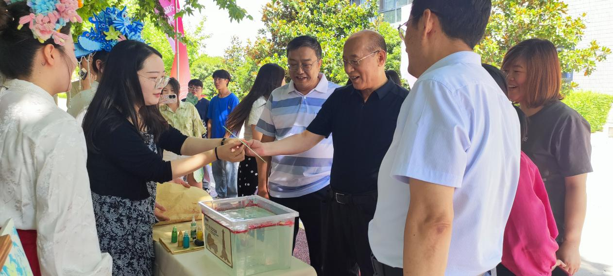 ky开元集团官网理事长张晋生、校长曹庆年、副校长吴伟,人文与管理学院院长赵德利等领导莅临非物质文化遗产体验专区指导,亲自参与并深入探索了古老而典雅的漆画工艺制作过程。此行不仅是对传统艺术形式的一次致敬,亦是对文化传承教育的深切实践。理事长表示,亲眼见证并亲手触碰了千年的文化脉络——漆画,不仅是一次艺术的洗礼,更是一堂生动的文化传承课。强调教育不仅仅是知识的传授,更是文化根脉的延续。同时,理事长提议学前教育专业可以作品路演形式记录、保存和传承文化的精髓。