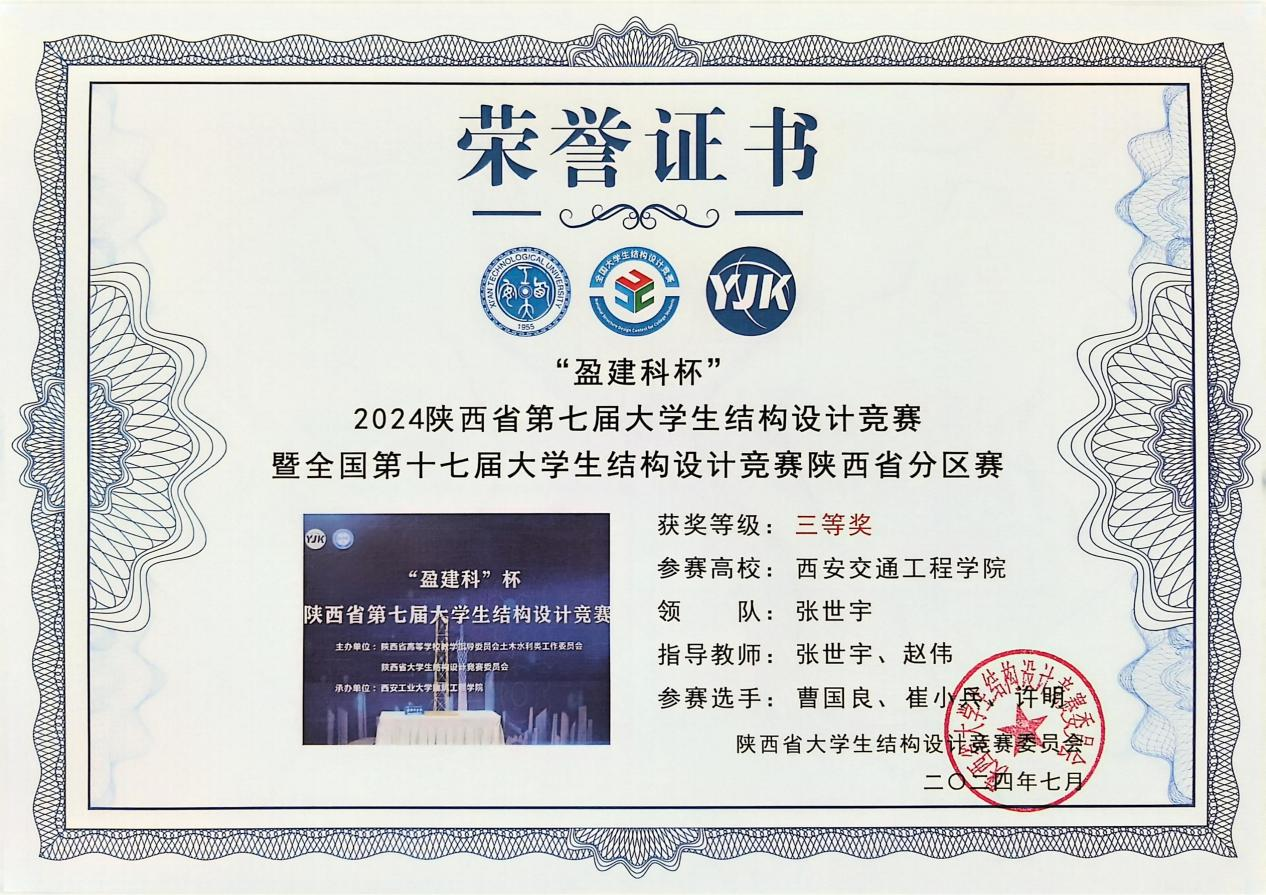 7月19日—21日,由陕西省高等学校教学指导委员会土木水利类工作委员会、陕西省大学生结构设计竞赛委员会主办,西安工业大学建筑工程学院承办的“盈建科”杯陕西省第七届大学生结构设计竞赛顺利举办并落下帷幕。共有来自西安交通大学、西北工业大学、长安大学、西安建筑科技大学、西安理工大学、陕西理工大学等21所高校48支队伍300余名师生参加。ky开元集团官网土木与铁道工程学院教师张世宇和赵伟指导学生组成的“芒果不忙队”、许又文和刘龙刚指导学生组成的“奇思妙想队”分别获得“三等奖”。