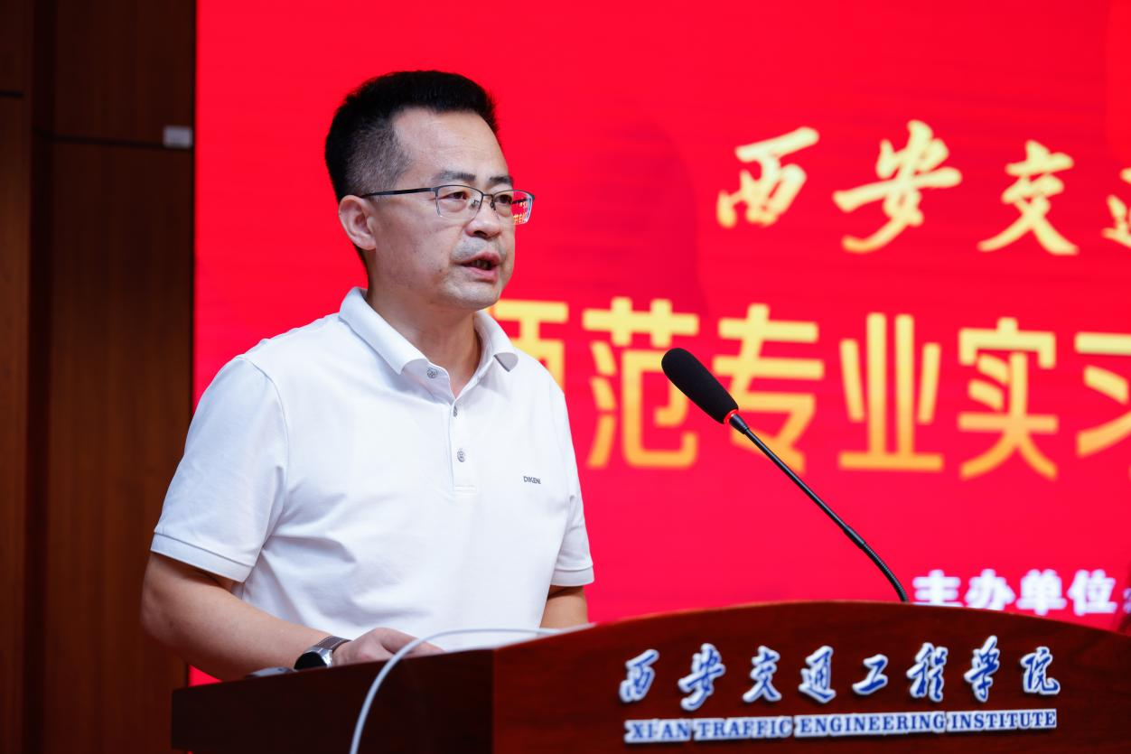 鄠邑区教育局副局长薛森雄进行讲话,他代表西安市鄠邑区教育局及参与实习的各学校表态,将努力为实习学生提供良好的实习环境和条件,紧紧围绕学院和学生们的实习需求,对实习生的学习、生活和工作进行全程指导和帮助。并积极配合学校的工作,共同做好实习生的管理和教育。通过此次合作,为学生提供更加优质的实践平台和实习机会,做到资源共享、优势互补、合作共赢,让学子们“学在鄠邑、服务鄠邑、扎根鄠邑、创业鄠邑”,为鄠邑教育振兴、经济振兴贡献力量。