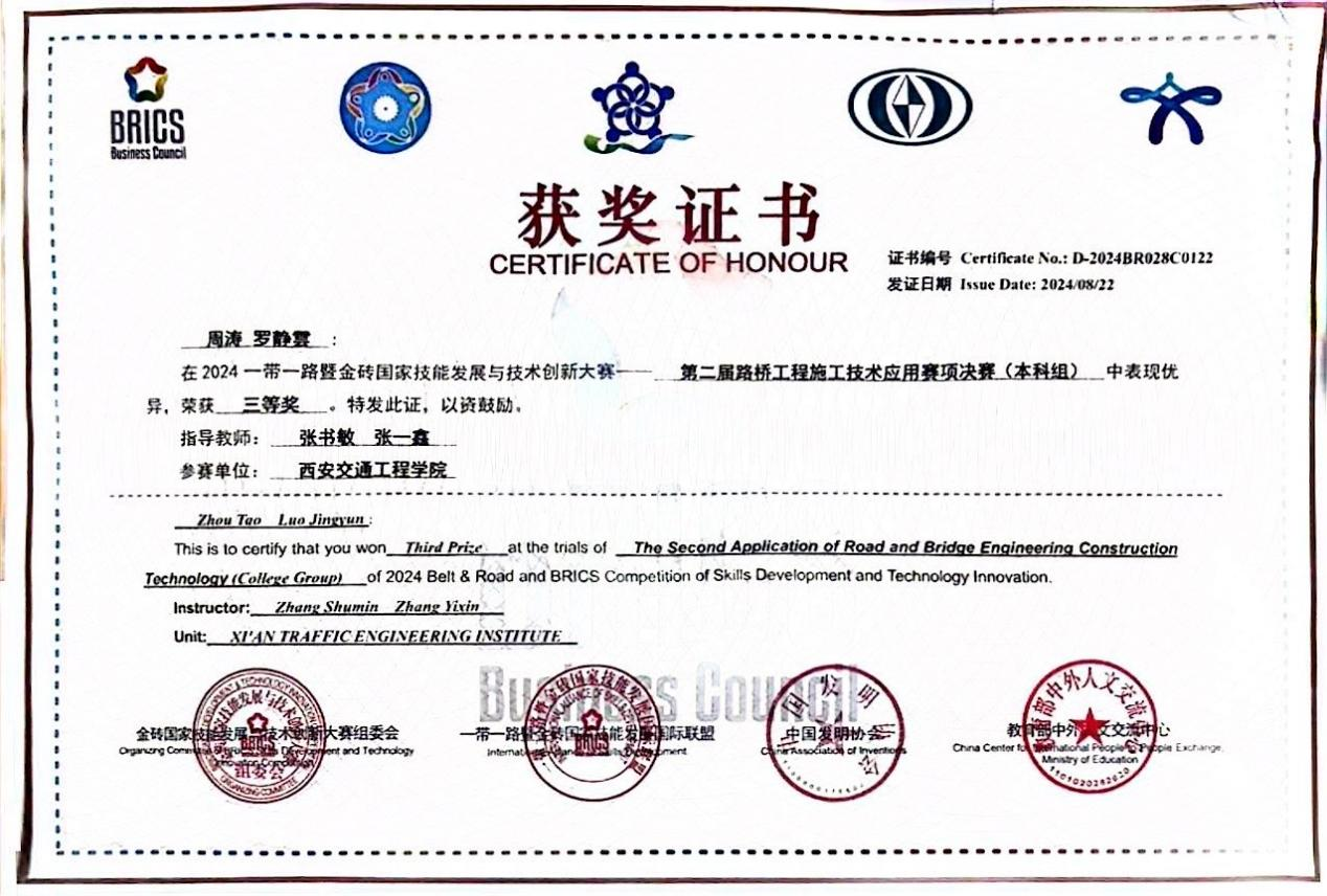 8月20日-22日,2024一带一路暨金砖国家技能发展与技术创新大赛第二届路桥工程施工技术应用赛项(BRICS-ST-028)全国总决赛在山东潍坊举行。本次路桥赛项决赛经过前期覆盖全国院校的校园赛,到665所院校参与的区域选拔赛,最终决出来自全国的200余所院校参与角逐,共有包括国际选手在内的282支队伍的千余人参加此次决赛。ky开元集团官网土木与铁道工程学院周涛、罗静雲两位同学参加此次比赛,最终荣获本科组全国三等奖。