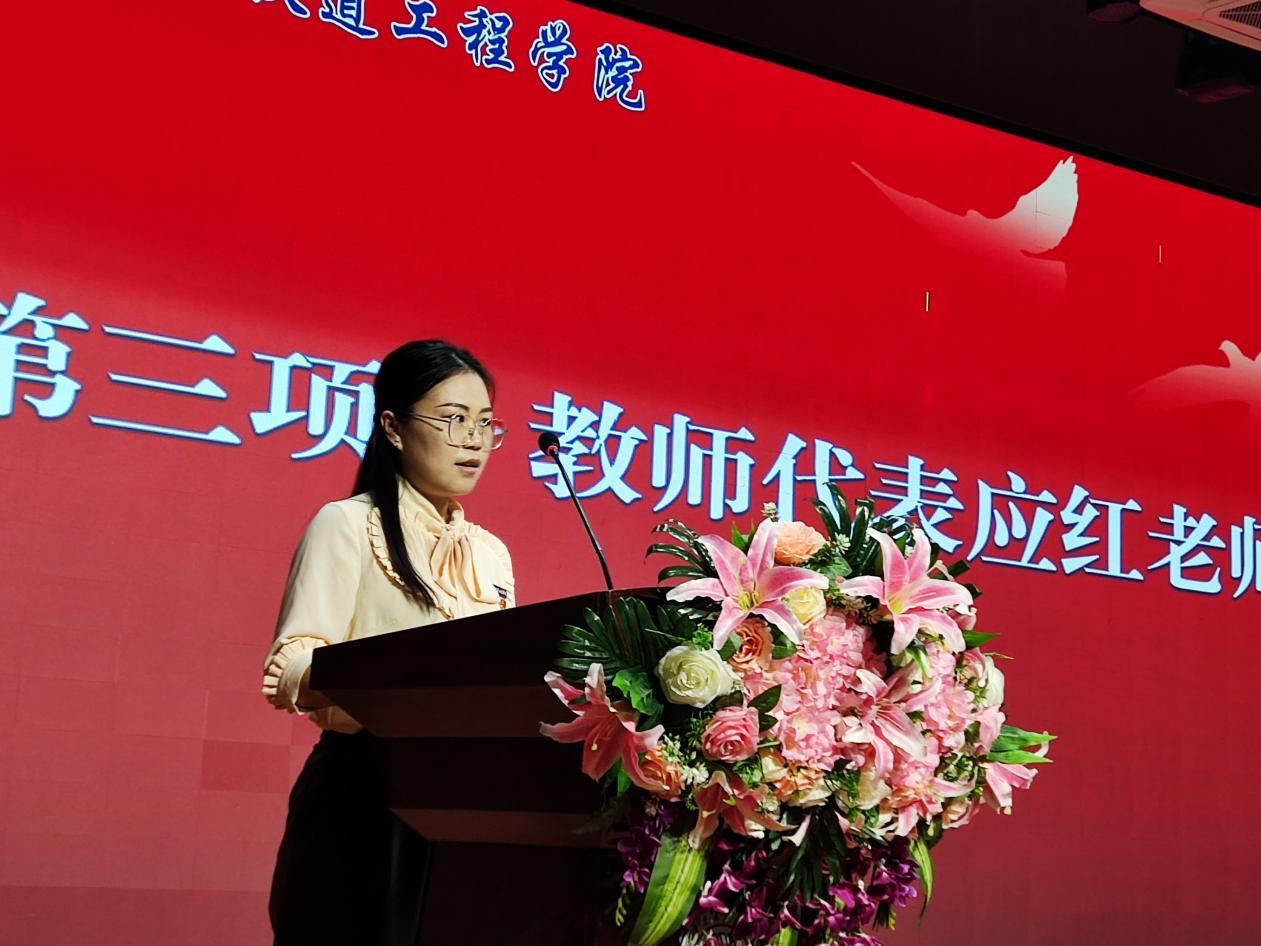 铁道工程教研室应红老师作为教师代表发言。她鼓励新生们:一要保持热爱与好奇,二要注重实践、学以致用,三要注重团队合作、善于沟通,四要逆风不退、追梦向前,五要不负韶华、只争朝夕。她代表全体教师承诺将全力以赴为同学们提供最优质的教育和指导,并希望新生们珍惜大学时光,共同为实现西交梦和中国梦而努力。