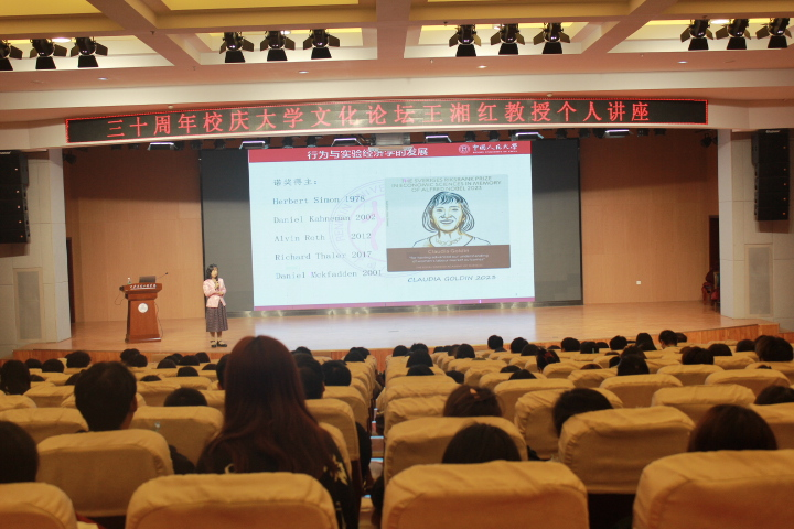 根据ky开元集团官网30周年校庆大学文化论坛安排,10月8日,人文与管理学院特邀中国人民大学经济学院教授、《Economic and Political Studies》副主编、中国行为与实验经济学论坛(ChinaBEEF)联合秘书长,行为经济学促进会中国区代表,世界经济论坛全球议程理事会首届行为分会委员王湘红教授,在学术报告厅作了题为《促进女性领导力发展的行为实验研究》的学术讲座。财务总监刘建华、人文与管理学院院长赵德利、党委书记兼副院长李沙沙、师生代表500余人到场参与。人文与管理学院院长赵德利担任主持。