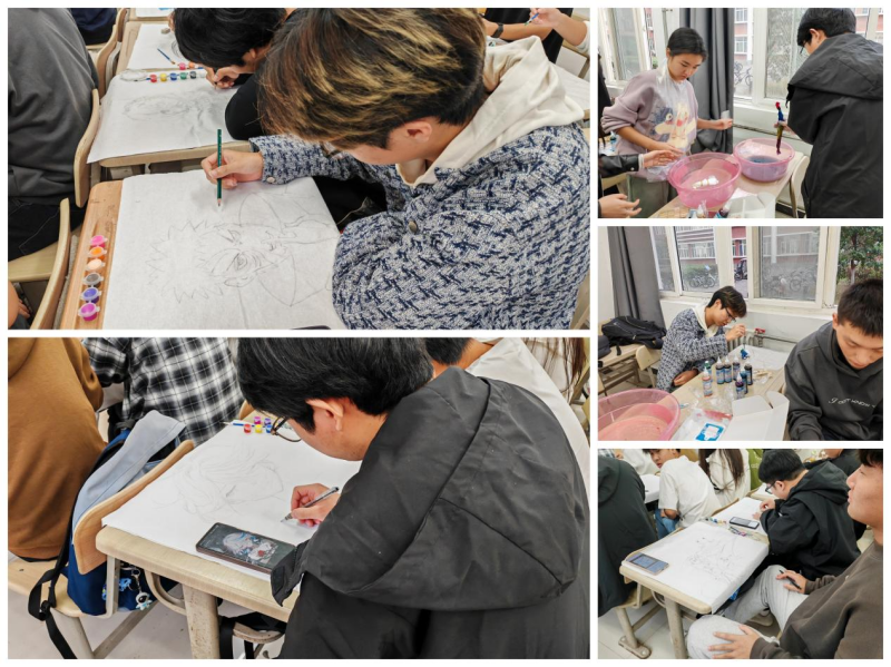 学生们在做手工扎染前期的绘制工作