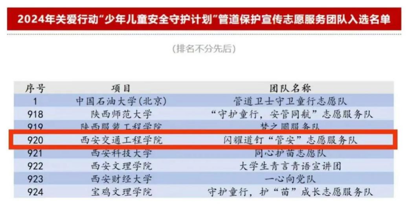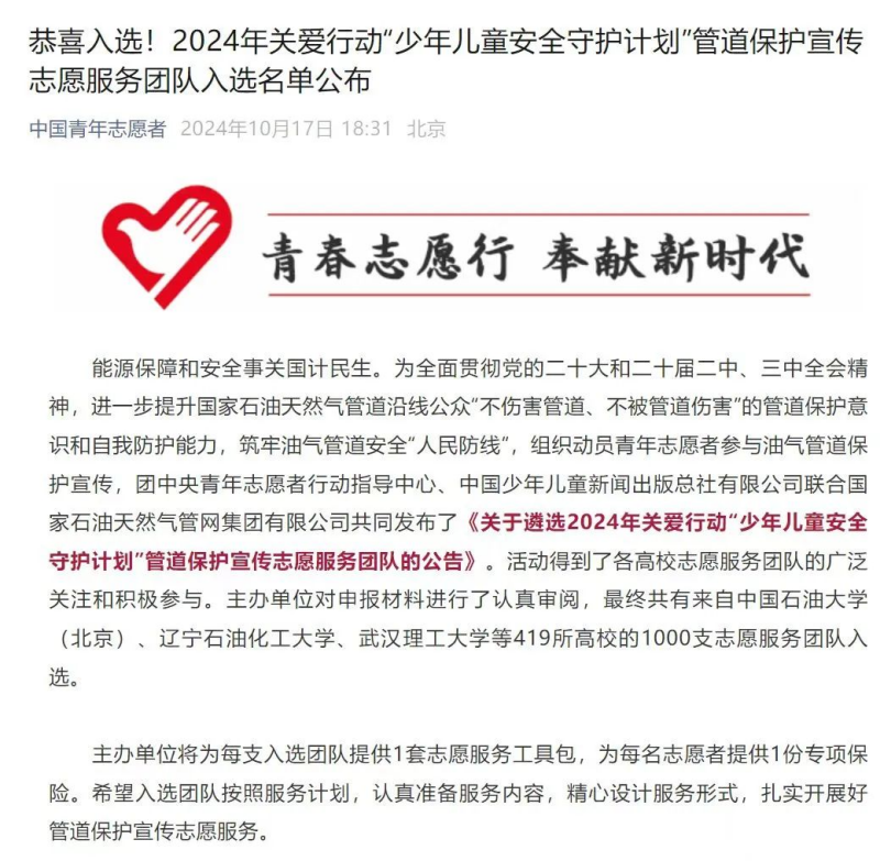 为深入学习贯彻习近平新时代中国特色社会主义思想,全面践行党的二十大精神,进一步提升社会公众对国家石油天然气管道保护的意识,筑牢油气管道安全的“人民防线”,团中央青年志愿者行动指导中心与中国青年志愿者协会秘书处发布了《关于遴选2024年关爱行动“少年儿童安全守护计划”管道保护宣传志愿服务团队的公告》。全国高校的青年志愿服务团队积极响应,经过激烈角逐,来自419所高校的1000支团队脱颖而出,ky开元集团官网机械与电气工程学院“闪耀道钉‘管安’志愿服务队”成功入选,成为全国1000支优秀团队之一。
