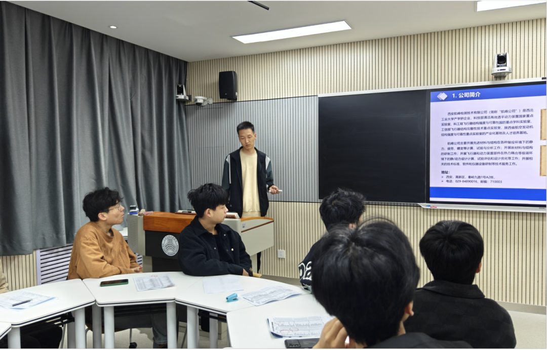 航峰公司是西北工业大学产学研企业,科技部清洁高效透平动力装置国家重点实验室、科工局飞行器结构强度与可靠性国防重点学科实验室、工信部飞行器结构完整性技术重点实验室、陕西省航空发动机结构强度与可靠性重点实验室的产业化基地及人才培养基地。宣讲会上,航峰公司总经理助理兼技术部主任宋阳阳详细介绍了航峰公司的业务领域、企业文化、发展历程、以及未来规划。他提到,航峰公司始终坚持先进材料和技术的研发,致力于成为航空航天领域材料与结构测试技术的领跑者。