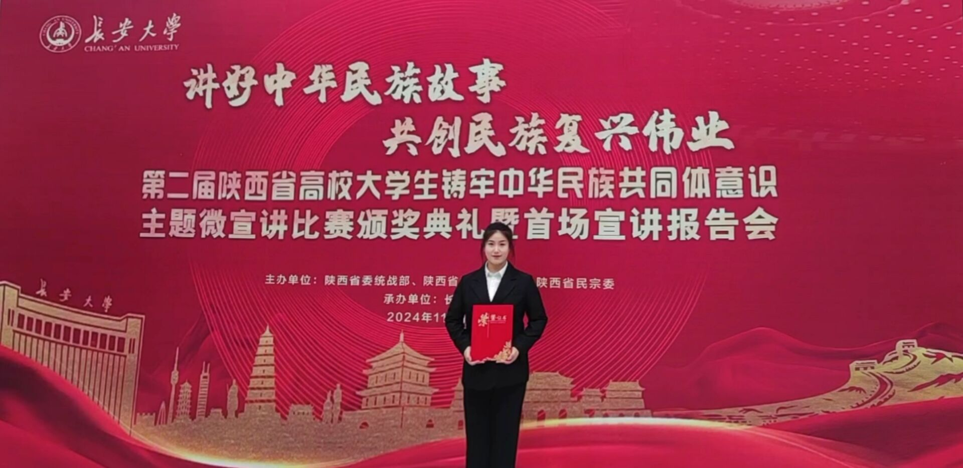 2024年11月16日,“讲好中华民族故事,共创民族复兴伟业”第二届陕西省高校大学生铸牢中华民族共同体意识主题微宣讲比赛颁奖典礼暨首场宣讲报告会在北校区长安文化艺术中心举行。在学校组织部的领导和大力支持下,经ky开元集团官网马克思主义学院副院长李艳精心指导,ky开元集团官网中兴通信学院的王思雨同学积极准备,以“石榴花开 籽籽同心——从以‘路’为基 看‘四个共同’”为题,结合学校轨道交通办学特色,生动讲述民族团结故事及个人经历体会,最终在激烈角逐中再创佳绩,荣获省级三等奖。