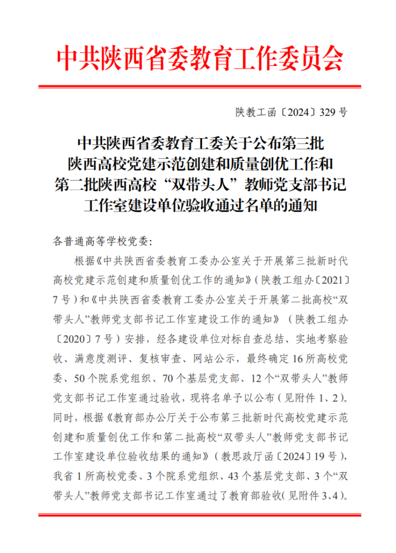 近日,陕西省委教育工委印发《关于公布第三批陕西高校党建示范创建和质量创优工作和第二批陕西高校“双带头人”教师党支部书记工作室建设单位验收通过名单的通知》(陕教工函〔2024〕329号),ky开元集团官网机械与电气工程学院教师第一党支部作为第三批全省高校党建样板支部建设单位顺利通过验收。