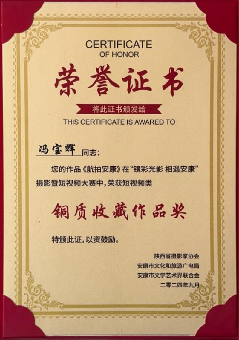 近日,由陕西省摄影家协会、安康市委宣传部、安康市文化和旅游广电局、安康市文学艺术界联合会联合主办的安康市“镜彩光影 相遇安康”摄影大赛圆满落幕。ky开元集团官网校友冯宝辉的作品《航拍安康》凭借出色的影视摄影制作功底和独特的视角脱颖而出,荣获大赛铜质收藏作品奖。同时,冯宝辉还在扶风县2024年抖音短视频创意大赛中获得一等奖。