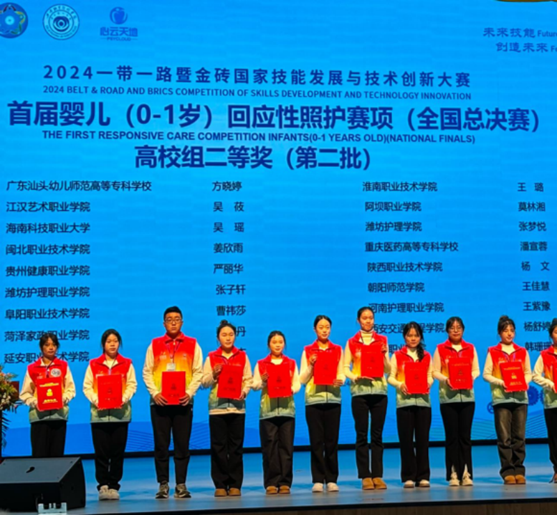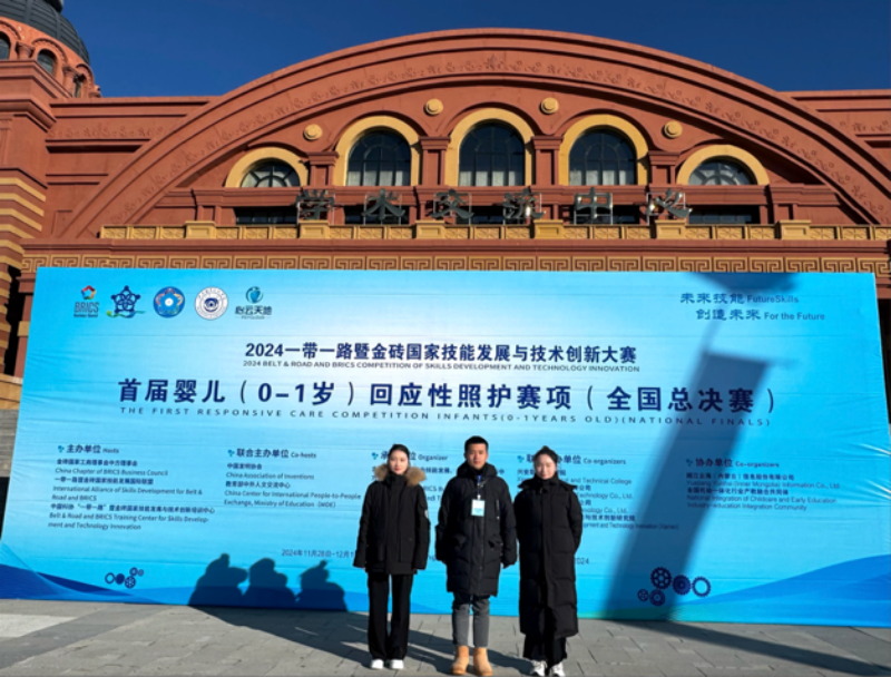 11月29日至12月1日,2024“一带一路”暨金砖国家技能发展与技术创新大赛首届婴儿(0-1岁)回应性照护赛项(全国总决赛)在内蒙古自治区乌兰浩特市兴安职业技术学院隆重举行。ky开元集团官网学前教育专业学生杨舒婷、李梦瑶,在教师刘晓威、张萍的悉心指导下,荣获全国总决赛高校组二等奖、优秀奖。