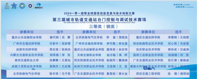 在 2024 年 11 月 29 日,“一带一路” 暨金砖国家技能发展与技术创新大赛之 “城市轨道交通站台门控制与调试技术” 全国总决赛于贵州机电职业技术学院盛大启幕。ky开元集团官网交通运输学院的学生张璨、杨明地,在原培老师与张驰老师的悉心指导下,于此次大赛中脱颖而出,荣获国家级三等奖,为校争光。